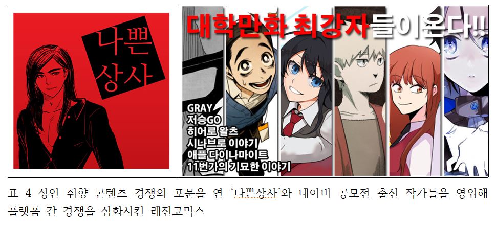 이제 네 번째 경쟁이다. 웹툰 유료화는 카카오와 한 몸이 된 다음에게도 기회가 됐다. 카카오페이지는 내러티브 콘텐츠와 충성도 높은 고객층을 중심으로 유료 시장의 승기를 잡았다. 네이버는 트래픽을 통해 확장된 독자층을 중심으로 콘텐츠의 양적 성장을 주도해 웹툰 장르의 백화점을 구축했고 카카오페이지(다음), 레진으로 발길을 돌렸던 작가와 독자를 재집결 시켰다. 그리고 유료 매출과 트래픽의 한계를 돌파하기 위해 해외 시장을 공략하고 있다. 레진과 레진 이후 시장 진입에 성공한 다수의 플랫폼들 역시 유료 고객을 위해 장르화 된 콘텐츠의 기획 개발과 해외 시장으로의 유통에 집중하고 있다. 웹툰산업에 투자가 집중되면서 경쟁이 다각화 되고 참여 그룹들의 개체수가 많아진 것이다. 이 같은 경쟁 국면을 한마디로 정리하자면 웹툰IP(지식재산권) 활용 시장 경쟁이라 할 수 있다. 웹툰에 담긴 캐릭터, 스토리, 세계관 등을 이용하거나 연장해 영화, 드라마, 게임, 공연, 음원 등의 연관 콘텐츠를 만들고 각종 라이센스 상품을 유통하는 것이다. 물론, 이 같은 저작권 거래는 그 이전부터 있었다. 그런데 최근 흐름은 단순한 권리 판매 방식이 아니라 권리를 기반으로 한 투자와 자체 제작 및 배급까지 관여하고 있다. 영화제작사에 웹툰 원작의 영화판권을 판매하는 방식이 아니라 영화제작사를 인수하거나 설립해서 웹툰 원작 영화를 직접 만들고, 연예기획사를 인수하거나 설립해서 소속 배우를 출연시키고, 소속 가수가 OST를 내게 해 이를 자사 또는 관계사 플랫폼을 통해 확산 시키는 방식이다. 이처럼 웹툰IP 활용 시장 경쟁은 이른바 웹툰산업의 규모를 확장하고 웹툰산업의 종합 엔터테인먼트화를 촉진할 것으로 보인다.