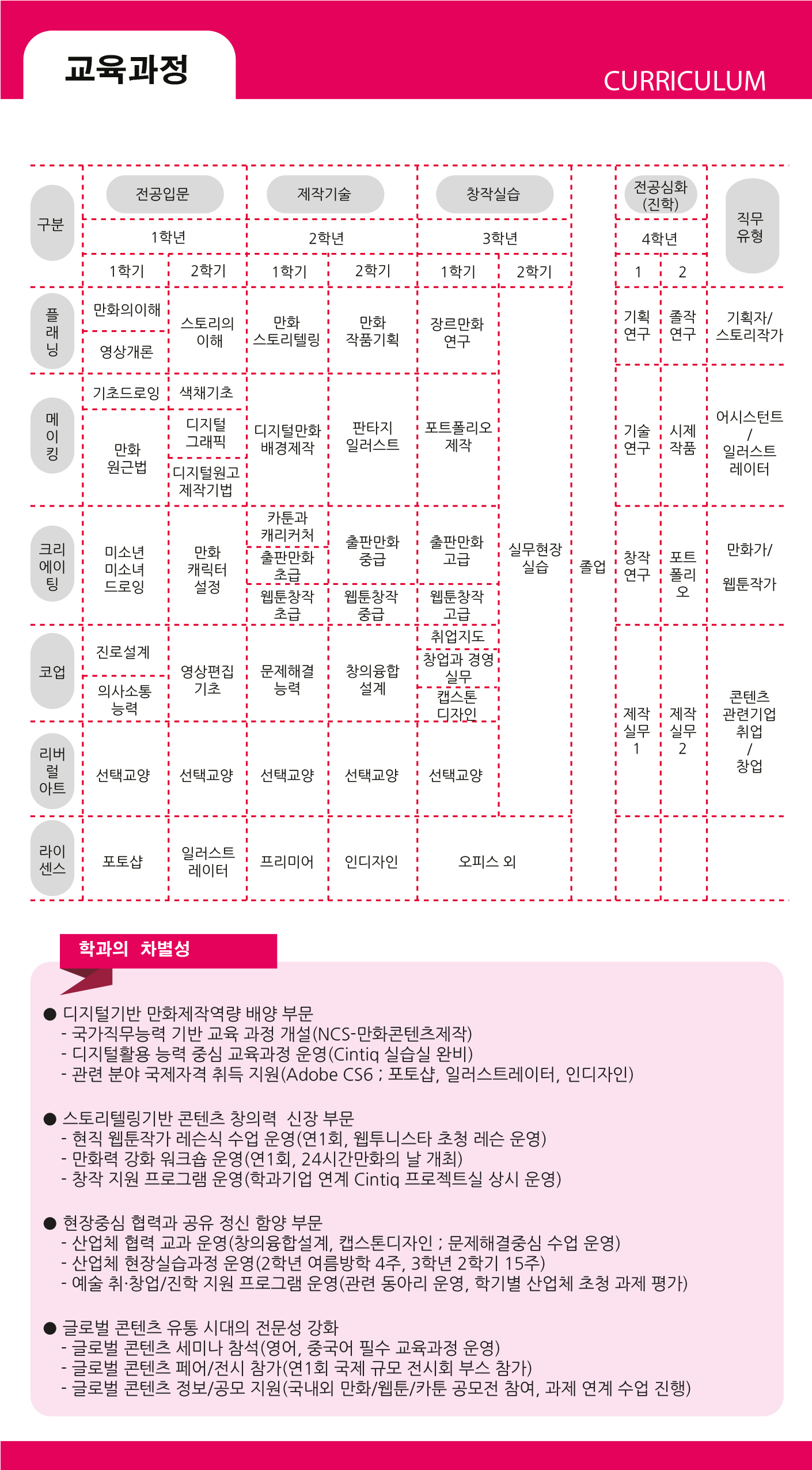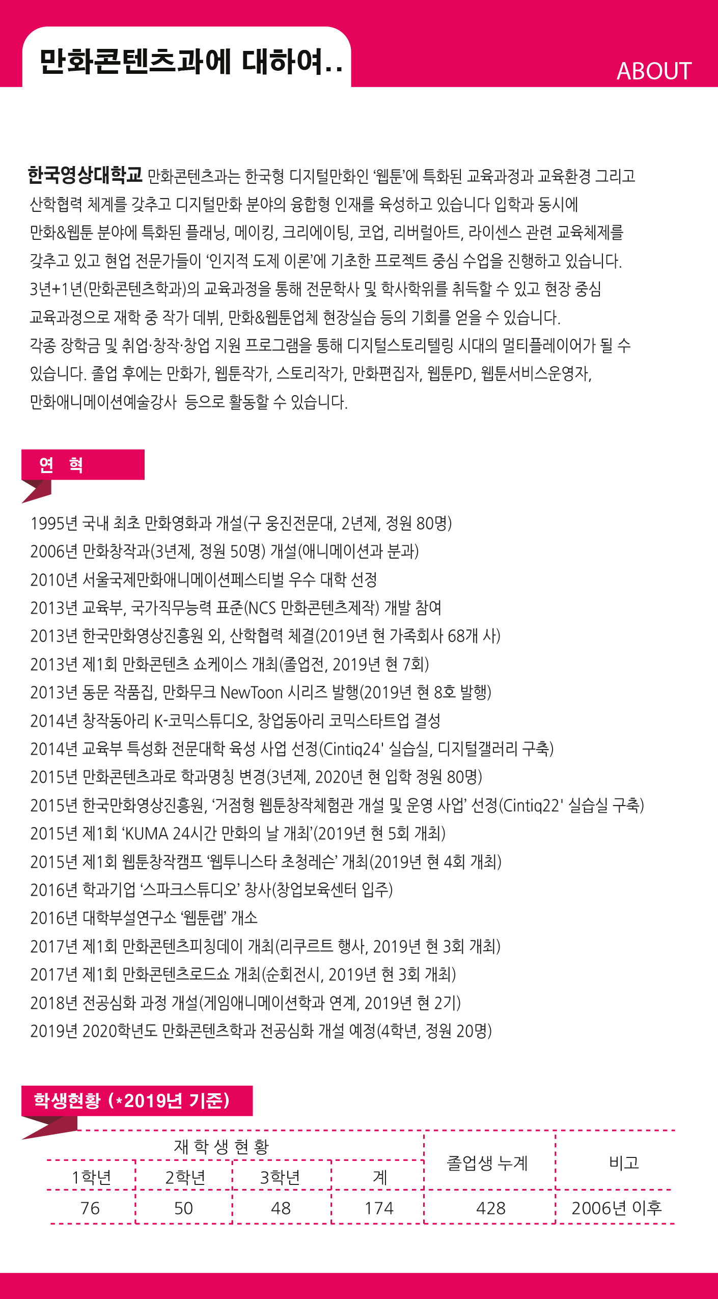 2006년 만화와 애니과 분과 후 2017년까지 입학정원이 50명(2분반)이었는데 매년 조금씩 늘면서 2019년부터 3분반 체제로 운영되고 있습니다.