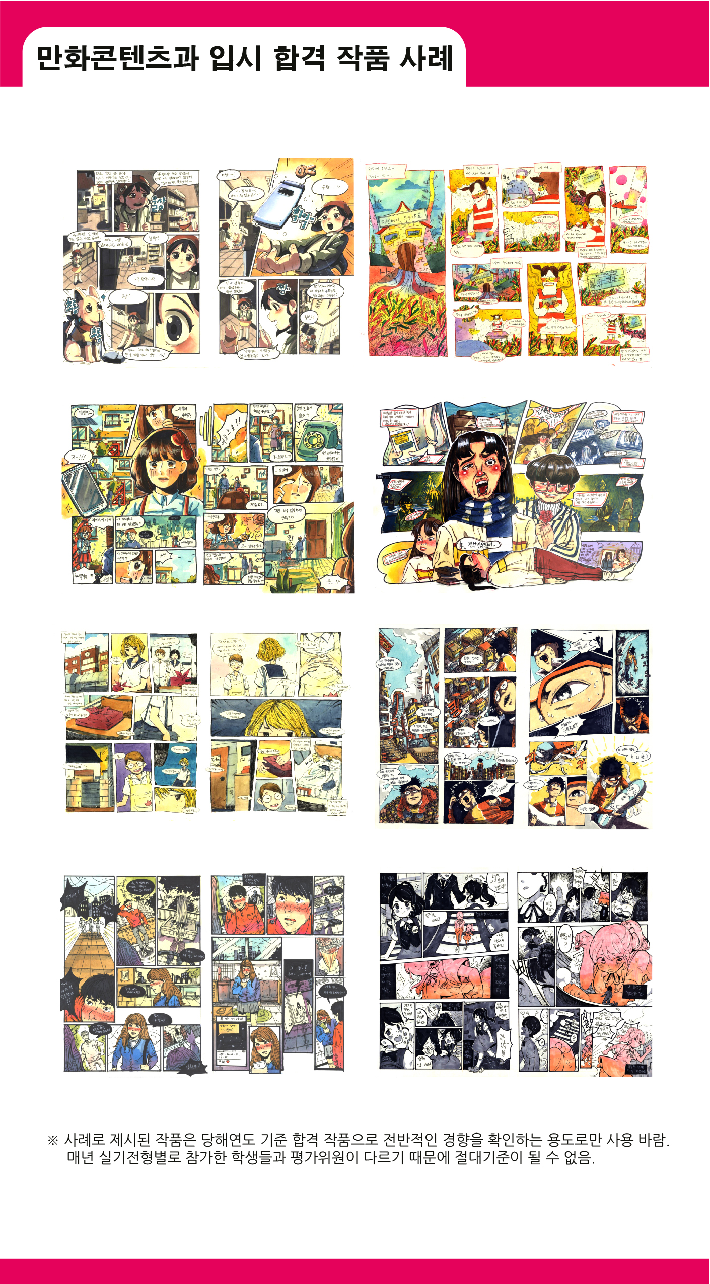무엇보다 실기고사 일자가 중요하지요. 만화과 수험생들은 대부분 여러 대학에 전형을 치기 때문에 실기고사 일자가 겹치면 곤란하니까요. 그래서 영상대 만화콘텐츠과는 수시1차(10.18~20)에는 3일 간, 수시2차(11.23~24)와 정시(1.17~18) 때는 2일 간 실기고사를 진행합니다. 다른 대학 실기와 겹치지 않는 날짜를 개인별로 선택하시면 됩니다. 고사 방식은 칸만화(2페이지 구성 권장), 웹툰(4단 구성 권장) 중 하나를 선택해 제시된 주제에 맞춰 4절 캔트지에 4시간 동안 그리면 됩니다. 실기반영비율은 60% 입니다. 교과가 30%, 비교과를 10% 반영합니다. 원서접수는 2019년 9월 6일부터 진행됩니다. 세부 일정은 홍보자료와 대학 입시사이트를 참고하세요.