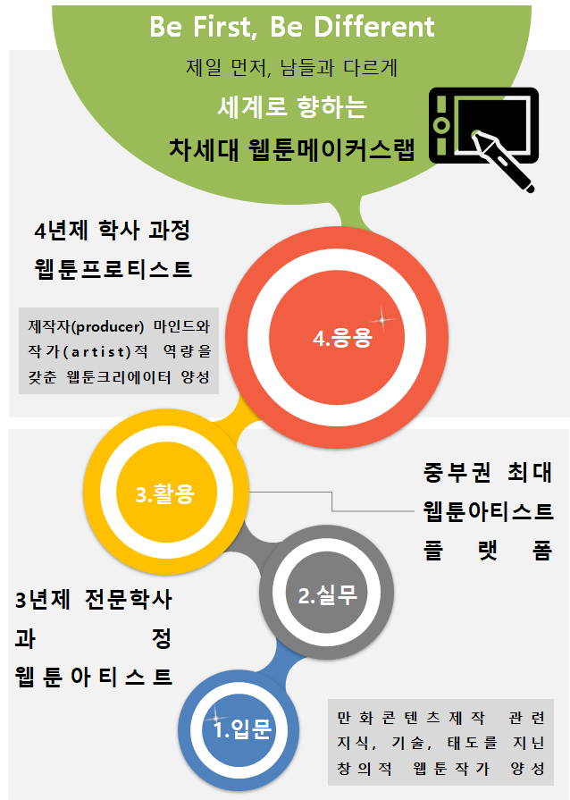 한국영상대학교는 대한민국의 새로운 중심, 행정수도 세종특별자치시에 있고 만화콘텐츠과는 웹툰작가 양성을 목표로 3년제로 운영되고 있습니다.
