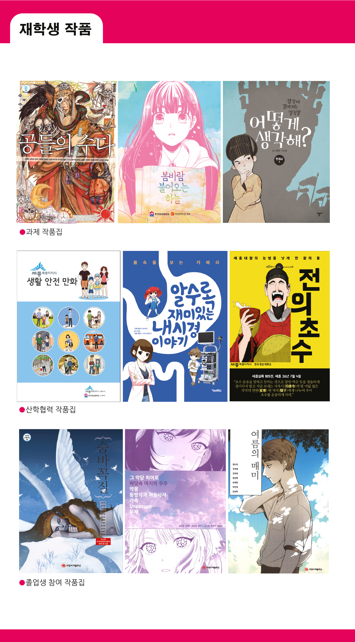 올 해 만화콘텐츠과는 7월 서울국제만화애니메이션축제, 8월 대전종합만화축제, 부천국제만화축제에 재학생 및 졸업생 작품전을 중심으로 홍보부스를 운영합니다.