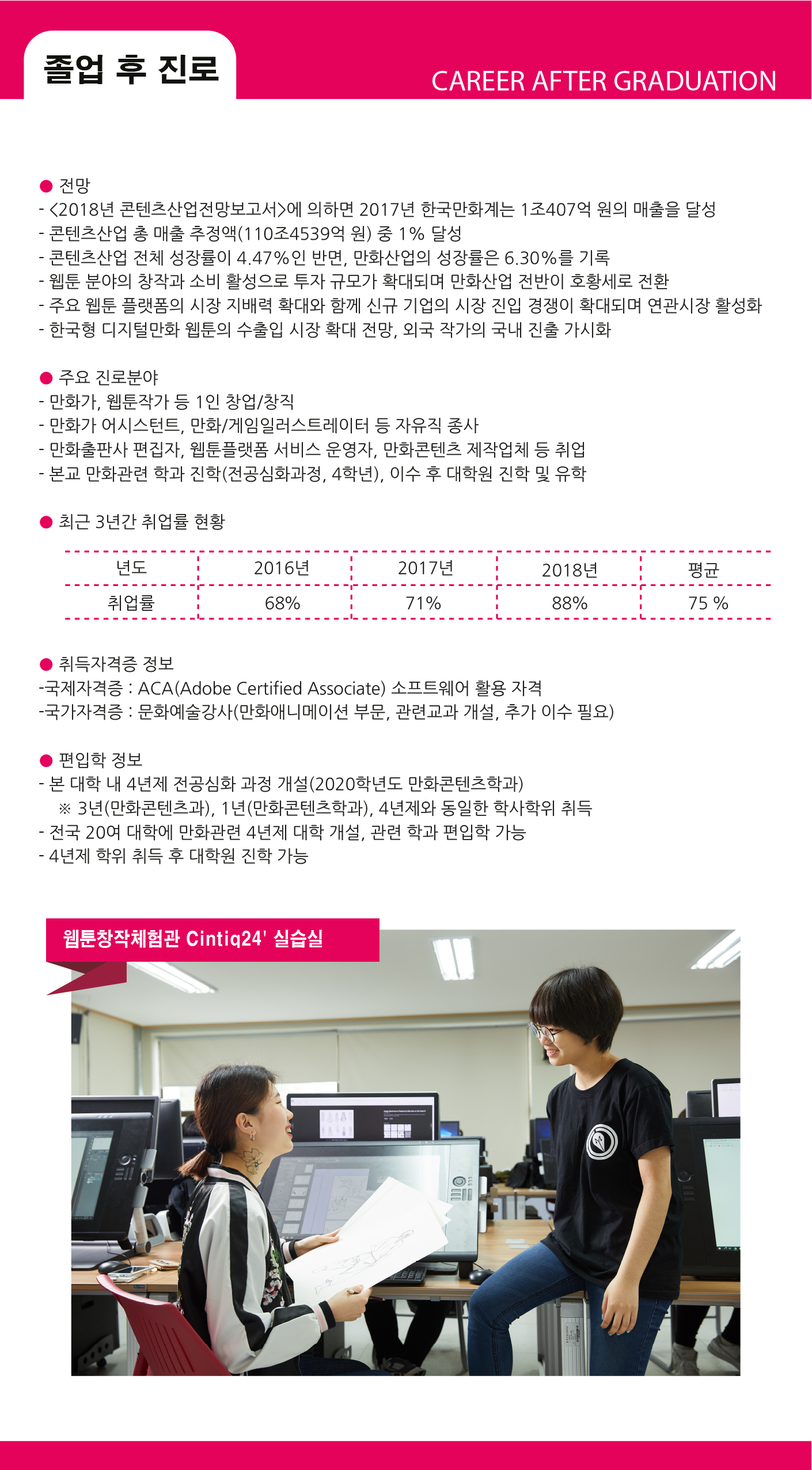 통상 예술계열 학과의 취업율은 낮은 편입니다만 영상대 만화콘텐츠과의 취업율은 비교적 높은 편입니다. 학기 중에는 공모전을 지원하고 졸업 전에는 산업체로 현장실습을 나갈 수 있도록 지원하고 있습니다. 학생들 대부분이 웹툰작가(프리랜서)를 희망하지만 웹툰제작사, 웹툰에이전시나 유통사 등에서 일하고자 하는 학생들도 많습니다. 그래서 졸업 후에도 작가 지망생을 위한 개인창작활동 지원, 취업자나 희망자들을 위한 산업체 추천 활동 등을 지속하고 있습니다.