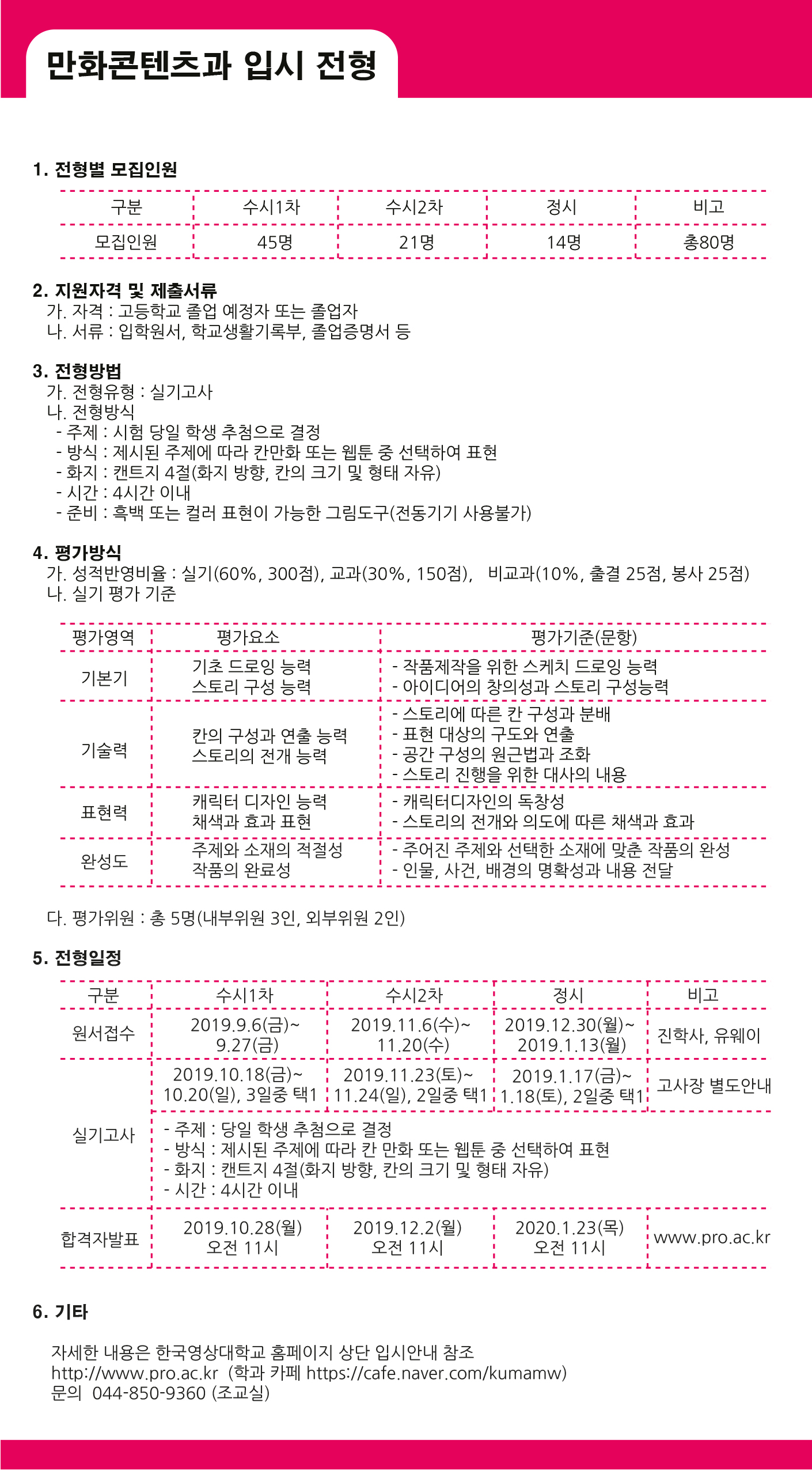 무엇보다 실기고사 일자가 중요하지요. 만화과 수험생들은 대부분 여러 대학에 전형을 치기 때문에 실기고사 일자가 겹치면 곤란하니까요. 그래서 영상대 만화콘텐츠과는 수시1차(10.18~20)에는 3일 간, 수시2차(11.23~24)와 정시(1.17~18) 때는 2일 간 실기고사를 진행합니다. 다른 대학 실기와 겹치지 않는 날짜를 개인별로 선택하시면 됩니다. 고사 방식은 칸만화(2페이지 구성 권장), 웹툰(4단 구성 권장) 중 하나를 선택해 제시된 주제에 맞춰 4절 캔트지에 4시간 동안 그리면 됩니다. 실기반영비율은 60% 입니다. 교과가 30%, 비교과를 10% 반영합니다. 원서접수는 2019년 9월 6일부터 진행됩니다. 세부 일정은 홍보자료와 대학 입시사이트를 참고하세요.