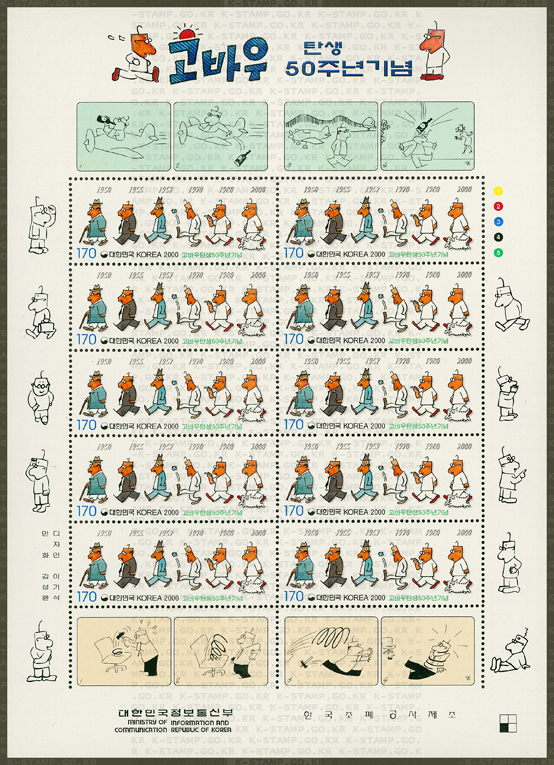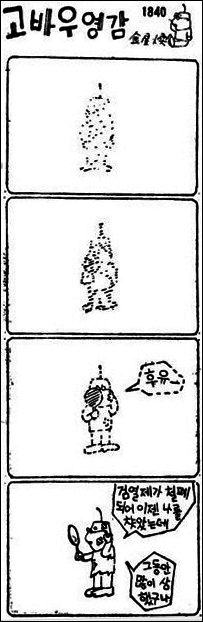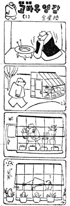 김성환의 <고바우 영감>은 1950년 육군본부가 발행한 [사병만화]에 첫 선을 보인 후 1955년 2월 1일 [동아일보] 연재를 시작으로 [조선일보](1980년부터), [문화일보](1992년부터)를 거치며 50년 간 총 14,139회 연재된 최장수 4칸 시사만화이다. 작은 키에 안경을 쓰고 콧수염을 기른 고바우 영감은 뾰족 솟은 머리칼 한 올로 감정을 표하고 수염에 가려진 입으로 지배 권력을 비판했다.