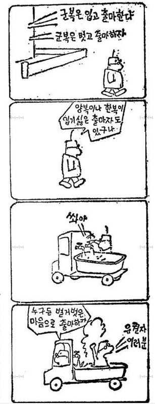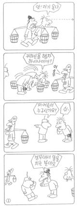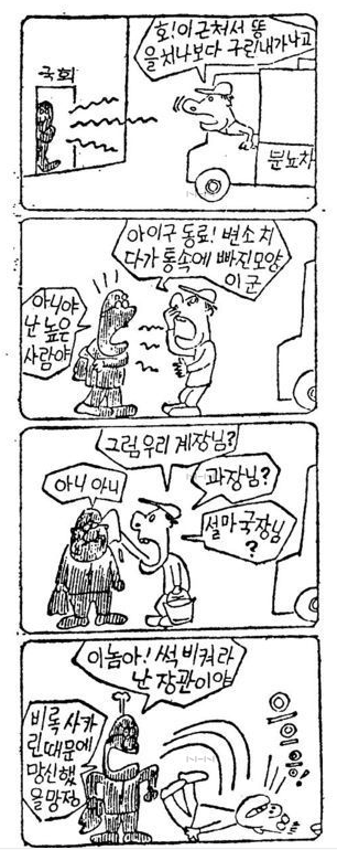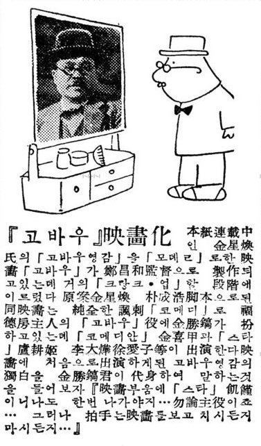 1958년 1월 28일자 [동아일보]는 김성환이 서울시경에 불려가 심문을 받았고 같은 해 1월 23일자에 그린 ‘고바우 영감’ 만화로 인해 입건 될 수 있다는 기사를 게재했다. 만화 내용이 국가에 대한 조롱이 담겨있고 불순하다는 이유로 경범법을 위반했다는 것. [동아일보]는 ‘신문만화가 본시 사회풍자를 지향하는데다가 만화 자체가 과장된 표현을 사용하는 것인데도 이를 악의적으로 곡해하고 수사기관에서 입건하려는 태도를 보이고 있는 점’은 선거 대비용이라 논하며 ‘어디까지나 사회의 어지러운 현상을 풍자를 한 것이지 경무대를 모욕할 의사는 추호도 없는 것이며 또 결과적으로 모욕이 됐다고도 생각하지 않는다’는 김성환의 입장을 전했다. 벌금형으로 끝난 이 사건 이후로도 김성환과 <고바우영감>은 권력의 북이라도 되는 양 시시때때로 뚜드려 맞았다. 하지만 고바우의 머리털이 구부러질지언정 김성환과 영감님은 이를 피하지 않았다. 탄압이 있으면 또 그 사건을 만화화하는 방식으로 절대권력과의 싸움에 물러섬이 없었다. 만화의 힘을 믿었던 것이다.