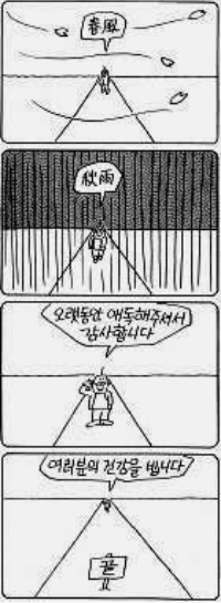 그 중 백미는 1960년 4월 27일자 [동아일보]에 실린 만화이다. 이승만 대통령이 하야를 결의했다는 기사가 1면에 실린 이날 <고바우영감>(1840회)은 달라질 세상에 대한 안도의 한숨과 함께 ‘검열제가 철폐되어 이젠 나를 찾았는데/ 그동안 많이 상했구나.’라며 기대 또는 또 다른 걱정이 담긴 한마디를 내 뱉는다. 이를 4칸 안에 담기 위한 연출 방식 역시 돋보인다. 점점이 사라졌던 고바우의 모습이 원상태로 돌아오지만 마지막 컷 속에서 거울을 보는 고바우는 이미 만신창이가 되어 있다. 그런 일이 반복되는 것이 또 십 수 년, 반백년을 한국 현대사의 격변기와 싸웠던 고바우는 2000년 [문화일보]를 통해 마지막 인사를 하며 고바우 또는 김성환이 걸었던 길을 묘사한다. 그 혹독했던 시기를 ‘춘풍(春風)’이라 했고 ‘추우(秋雨)’라 기억하며 사람들의 ‘건강’을 빌었다. 반백년, 지금의 우리와 오늘의 여기를 이끌어낸 이가 던지는 마지막 걱정이다. 그의 걱정처럼 지금 우리는 ‘건강’한 걸까.