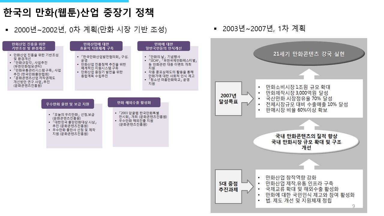 한국의 만화산업은 2000년 이후 본격화된 정부의 재정 지원 정책으로 현재 웹툰 중심으로 변화 했고 많은 성과를 내고 있습니다. 초기 정부의 만화정책은 유통 기반조성, 지원체계 구축, 대국민 인식개선, 우수만화 출판 및 보급, 해외 진출 지원으로 이뤄졌습니다. 1차 중장기 계획은 ‘만화콘텐츠 강국 실현’을 목표로 창작역량 강화, 유통 인프라 구축, 국제 교류 및 수출 활성화, 대국민 인식 제고, 법‧제도 개선을 5대 과제로 선정해 추진했습니다.
