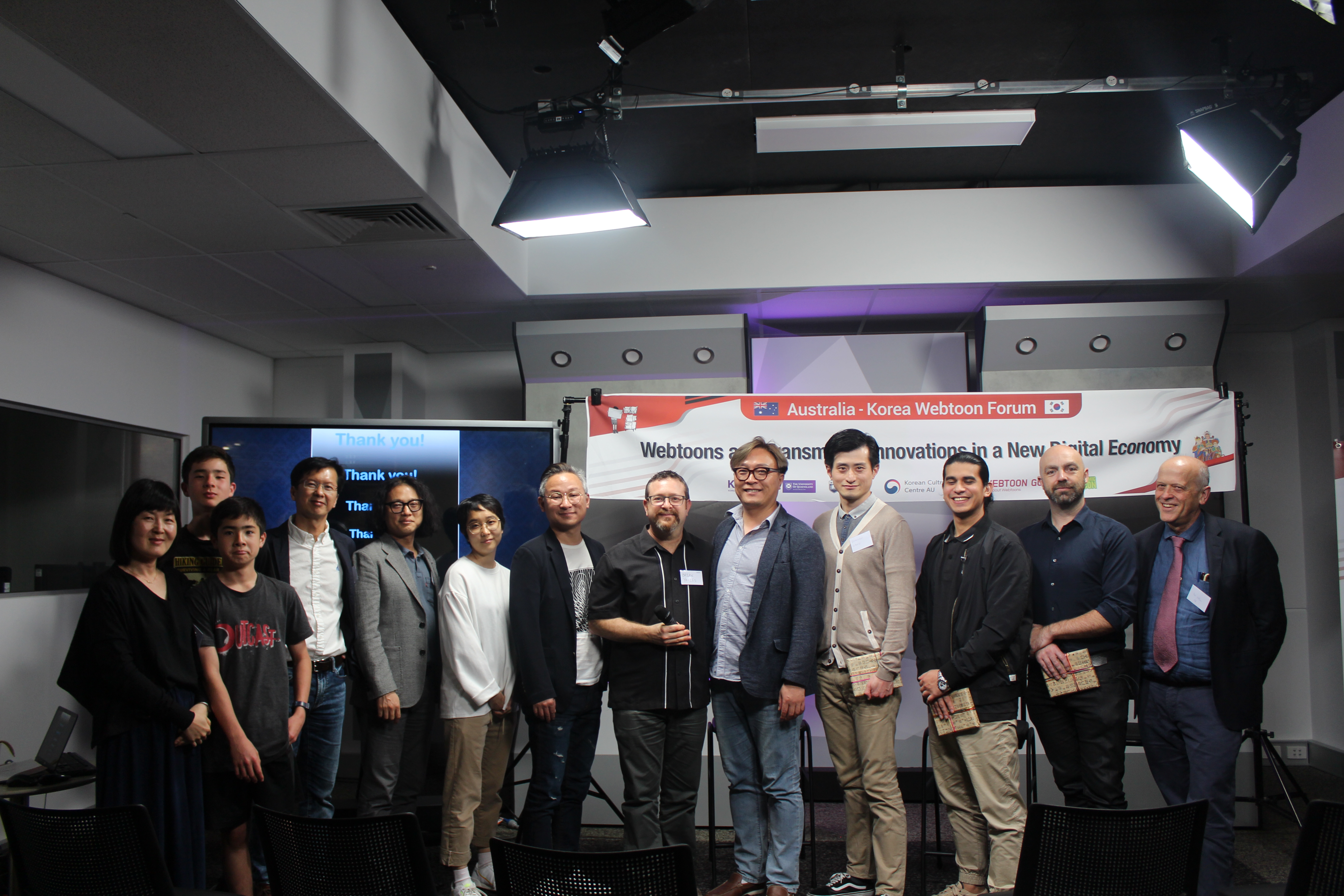 지난 9월 27일, 10월 1일 두차례에 걸쳐 한국과 호주의 웹툰 연구자 간 포럼 호주 시드니와 브리즈번에서 진행됐습니다. 한국콘텐츠진흥원의 지원으로 추진된 이 행사는 한국의 웹툰가이드와 호주의 울런공 대학 간 협력으로 추진됐습니다. 자국 만화의 생산이 미흡한 호주는 일본망가와 미국코믹스의 소비 시장이 되고 있습니다. 울런공 대학의 브라이언 교수님은 이 같은 상황을 개선하고 차세대 문화콘텐츠 생산에 주력하기 위한 방향으로 한국의 웹툰과 웹툰의 트랜스미디어 전략에 대해 깊은 관심을 지니고 있었고 이를 주제로 호주 정부의 연구과제를 추진하고 있었습니다.