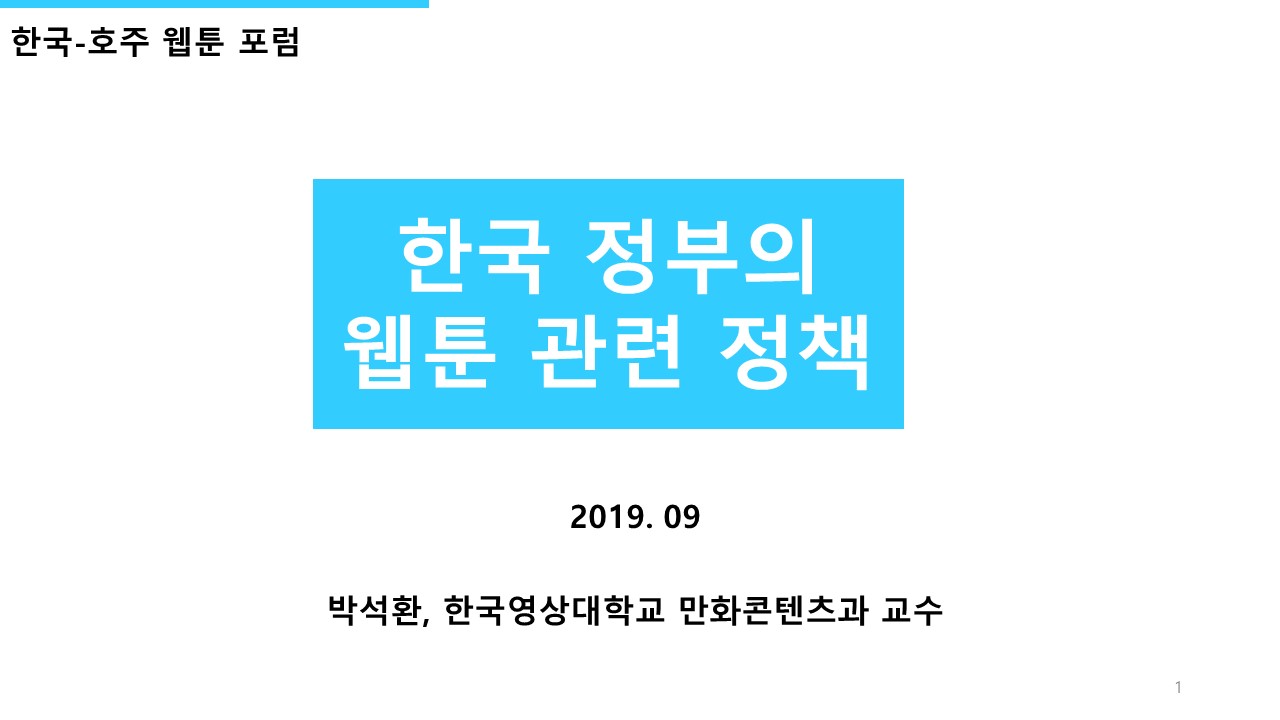 오늘은 한국 정부가 웹툰을 포함한 만화산업 전체를 발전시키기 위해 어떤 노력을 했는지에 대해서도 말씀드리도록 하겠습니다. 기회가 된다면 호주의 만화산업 관련 정책에 대해서도 듣고 싶습니다.