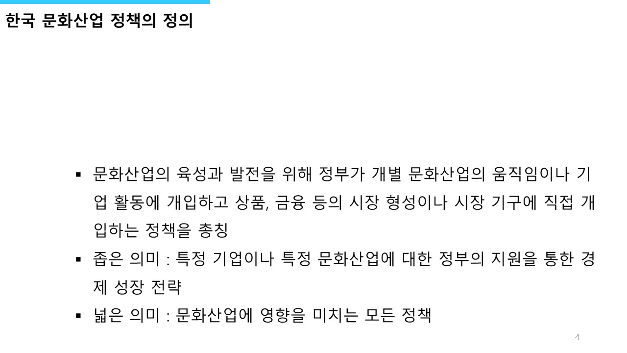 한국은 문화산업의 육성과 발전을 위해 정부가 직간접적으로 개입하고 있습니다. 작게는 특정 기업이나 장르를 전략적으로 지원하기도 하고 넓게는 법률이나 제도적 장치를 통해 특정 분야의 문화산업을 성장시키거나 통제하기도 합니다. 스크린쿼터 제도 같은 것이 통상적으로 알려진 문화산업 정책이라 할 수 있습니다. 자국 영화산업을 보호하기 위해 외국영화의 상영 비율을 제한하고 시장 수요가 부족하더라도 특정 장르의 영화가 제작될 수 있도록 자금 지원을 하는 경우입니다.