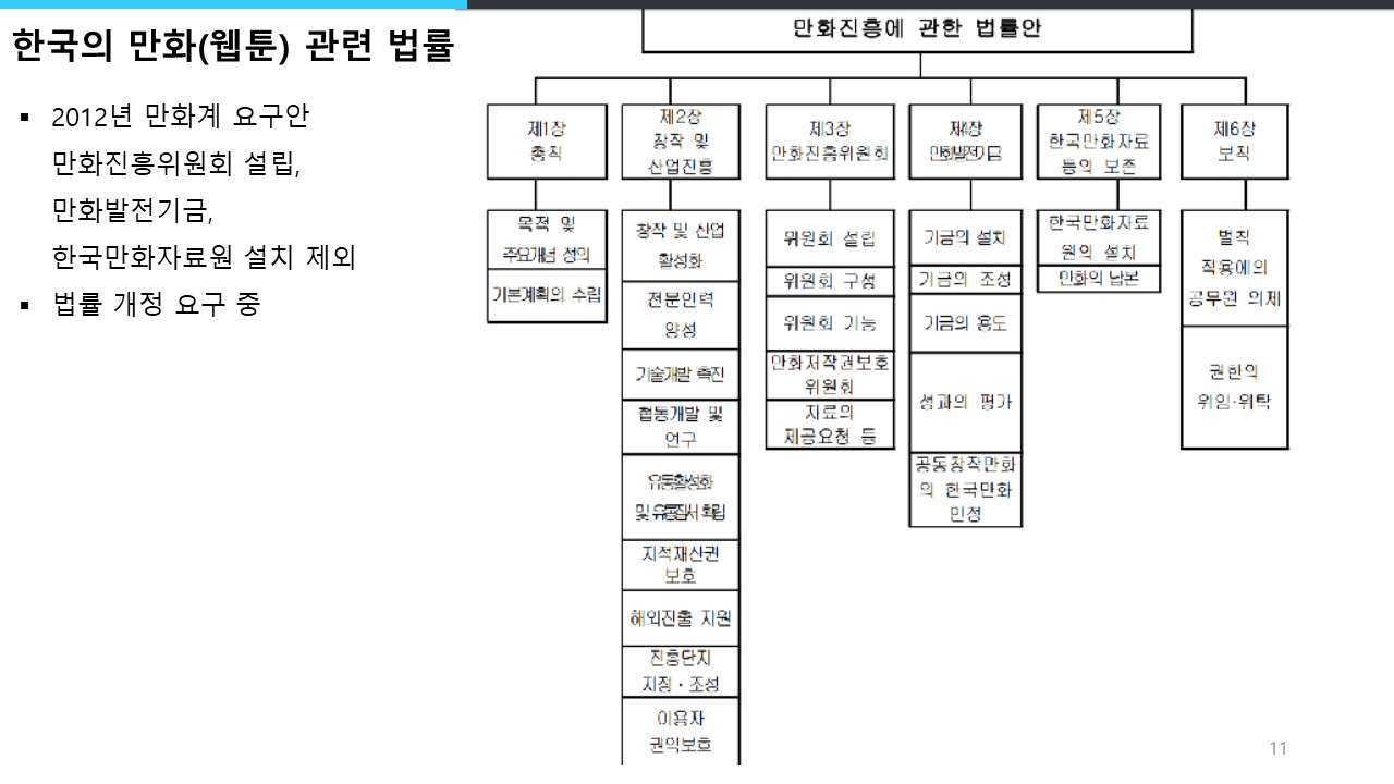 한국 정부의 웹툰을 포함한 만화정책은 행정 제도 측면과 함께 법률적 지위도 확보하고 있습니다. 정부는 만화산업을 육성하기 위해 2012년 만화계의 요구를 수용해 만화 진흥에 관한 법률을 제정했습니다. 제정 당시 만화계는 독립적인 만화진흥위원회 설립, 만화발전기금 조성, 한국만화자료원 설치 등을 요구했지만 정부 재정부담, 업무 중복 등의 이유로 수용되지 않았습니다. 현재 한국 만화계는 정부와 입법부(국회)에 이를 수용한 법률 개정을 요구하고 있습니다.