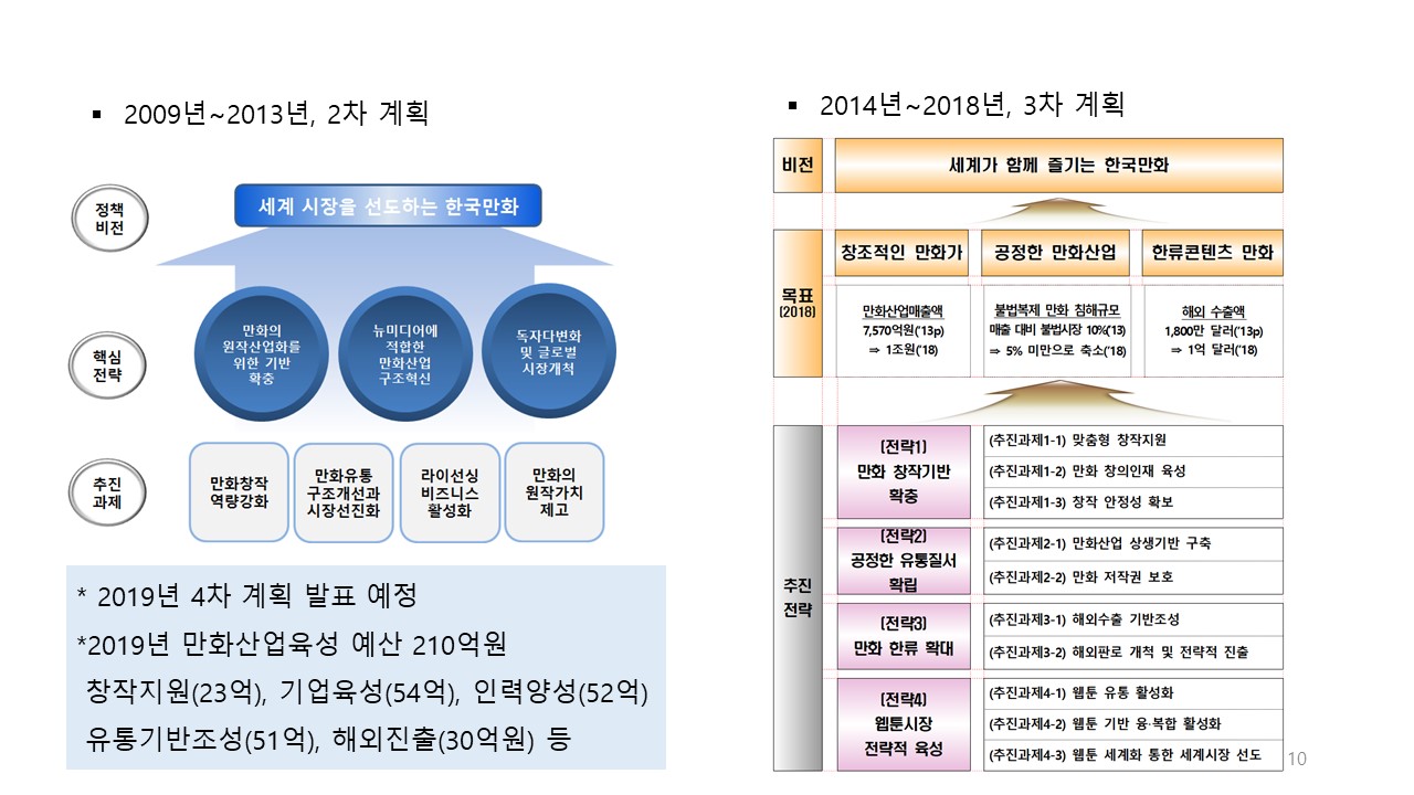 한국의 만화산업은 2000년 이후 본격화된 정부의 재정 지원 정책으로 현재 웹툰 중심으로 변화 했고 많은 성과를 내고 있습니다. 초기 정부의 만화정책은 유통 기반조성, 지원체계 구축, 대국민 인식개선, 우수만화 출판 및 보급, 해외 진출 지원으로 이뤄졌습니다. 1차 중장기 계획은 ‘만화콘텐츠 강국 실현’을 목표로 창작역량 강화, 유통 인프라 구축, 국제 교류 및 수출 활성화, 대국민 인식 제고, 법‧제도 개선을 5대 과제로 선정해 추진했습니다.