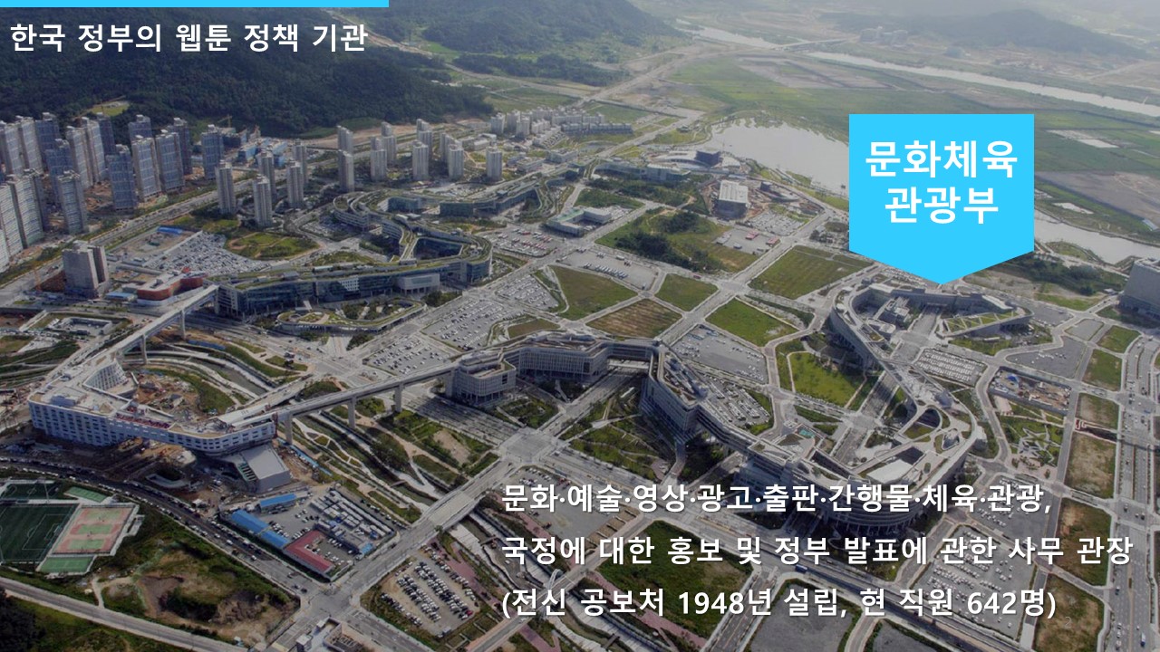 한국 정부 중 웹툰을 관장하는 기관은 문화체육관광부입니다. 문화, 예술, 영상, 광고, 출판 등 문화산업과 예술 전반을 담당하는 곳입니다. 한국하면 수도 서울을 떠 올립니다만 한국 정부의 행정기관들이 모여 있는 도시가 따로 있습니다. 세종시입니다. 1948년 대한민국 정부수립과 함께 공보처라는 이름으로 설립되었고 현재는 642명의 직원이 일하고 있습니다. 콘텐츠정책국 대중문화산업과에 만화를 담당하는 사무관과 주무관이 있습니다. 정책 사업을 수행하는 관련 기관으로 한국콘텐츠진흥원 대중문화본부 만화스토리산업팀이 있고 정부의 만화산업육성 보조사업자로 한국만화영상진흥원 등이 있습니다.