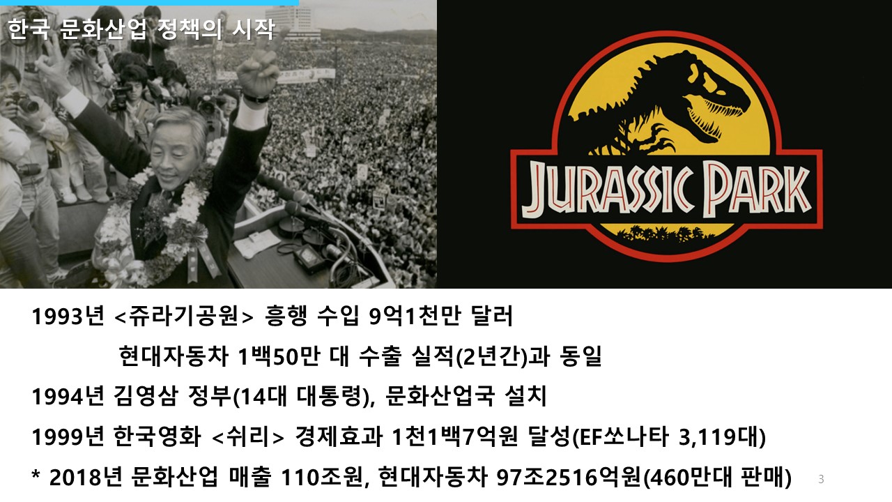 한국의 문화산업 정책은 문화체육관광부 콘텐츠 정책국이 총괄하고 웹툰을 포함한 만화는 영화, 방송, 게임, 음악, 출판 등과 함께 그 중 한 분야입니다. 정부 수립 후 한국의 문화산업정책은 대체로 규제 중심이었습니다. 미국, 일본 등의 문화가 무분별하게 유입되는 것을 막기 위한 조치였습니다. 그런데 1993년 김영삼 대통령이 취임하고 한국에 스티븐 스필버그 감독의 <쥬라기공원>이 개봉하면서 상황이 달라졌습니다. 당시 <쥬라기공원>의 전 세계 흥행 수입이 9억1천만 달러라는 보도가 있었고 이는 한국의 대표적 수출상품이었던 현대자동차의 2년 간 매출과 같은 규모였습니다. 김영삼 대통령은 문화의 산업적 가치, 경제적 효과를 강조했고 당시 문화관광부에 문화산업국을 설치했습니다. 그 때부터 정부는 영화 수익 등을 발표할 때 자동차 몇 대를 판 효과를 얻었다고 했습니다. 현재는 한국의 문화산업 규모도 커졌고 현대자동차의 매출도 커졌지만 묘하게 비슷한 규모를 유지하고 있습니다. 110조원이니까 약 9억 달러 정도 됩니다.