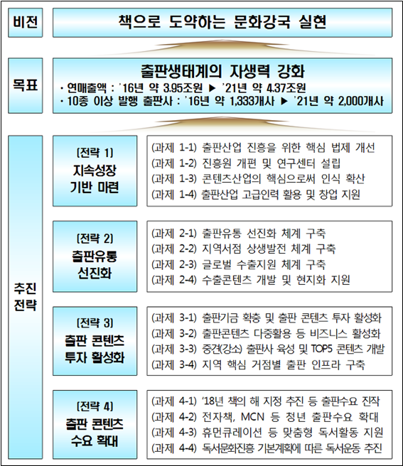 정부(문화체육관광부)는 지난 2017년 출판문화산업진흥5개년계획(’17~’21)을 발표했다. 이 계획의 핵심은 출판유통선진화시스템구축이다. 당시 보도자료에 의하면 ‘문체부는 출판유통 선진화를 위해서는 도서 판매량 및 재고, 신간 정보 등 생산·유통 정보가 통합적으로 제공되는 출판정보시스템 구축이 선행되어야 한다고 보고, 현재 ▲서점 판매 시점 정보관리시스템(POS) ▲국제표준도서번호(ISBN) 서지정보시스템 ▲오닉스(ONIX) 기반 출판유통정보시스템 등으로 분산 추진되고 있는 생산·유통 시스템의 연계·통합을 추진한다.’는 것이다. 정부는 이를 위해 출판정보위원회 출범, 한국출판유통정보센터 설립, 도서정가제를 합리적으로 보완한 출판문화산업진흥법 개정, 한국출판산업연구개발센터 출범, 출판정책기획단 조직 등을 추진한다고 밝혔다.