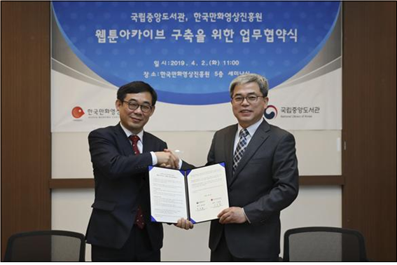 웹툰 도서정가제 논란이 불거지기 전인 4월 2일, 공교롭게도 한국만화영상진흥원은 국립중앙도서관과 ‘웹툰 아카이브 구축 사업을 위한 업무 협약’을 체결한다. 도서관법 제20조 2항(온라인 자료 수집)을 근거로 웹툰 자료의 법적 수집과 보존 권한을 지닌 국립중앙도서관과 협약해 웹툰 자료의 유실을 막고 영구 보존한다는 계획이다.