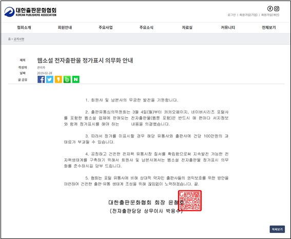 지난 2월 28일 대한출판문화협회는 도서정가제 관련 관리감독 기능을 지닌 출판유통심의위원회가 ‘카카오페이지, 네이버시리즈 포털사를 포함한 웹소설 업체에 판매되는 전자출판물(웹툰 포함)은 반드시 매 편마다 서지정보와 함께 정가표시를 의무화’하라는 내용을 의결했다며 회원사에 공문(문서명 ‘웹소설 전자출판물 정가표시 의무화 안내’)을 발송했다.