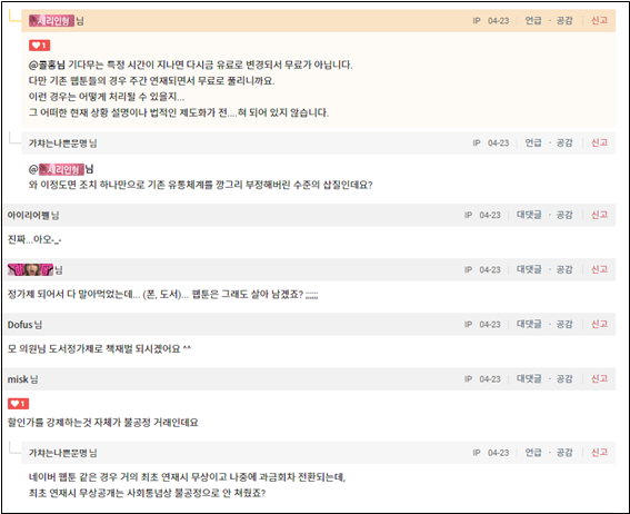 기사가 SNS와 각종 커뮤니티사이트로 퍼지면서 업계 관계자나 일반 사용자들은 부정적 반응을 나타냈다. ‘사용자에게는 불리하고 업계에는 불편한 제도’라는 의견부터 ‘잘 되고 있는 분야(웹툰/웹소설)를 안 되는 제도(도서정가제)로 망치려 한다’는 의견까지 다양했다. 반면, 공문을 발송한 기관과 위원회 관계자들은 ‘법률에 따라 지켜야 하는 것’이고 ‘당장에 적용하라기보다는 점진적으로 실행할 수 있도록 계도 중’이라는 입장이다.