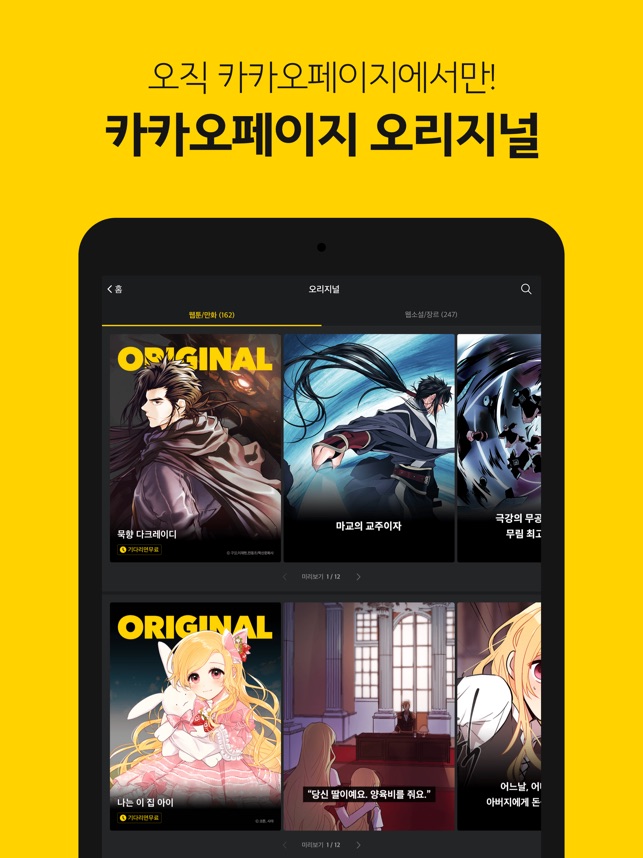 - 카카오페이지는 오픈 시부터 웹툰제작사/유통사와의 파트너십을 강화해 독점 웹툰만 연재되는 네이버웹툰과 차별화를 시도, 대다수의 웹툰(비독점 연재 작품)이 게재된 초대형 유통망 조기 구축, 이를 바탕으로 ‘독점 연재 작품’ 및 ‘오리지널 작품(자체 기획)’을 우선 시 하는 전략 추진