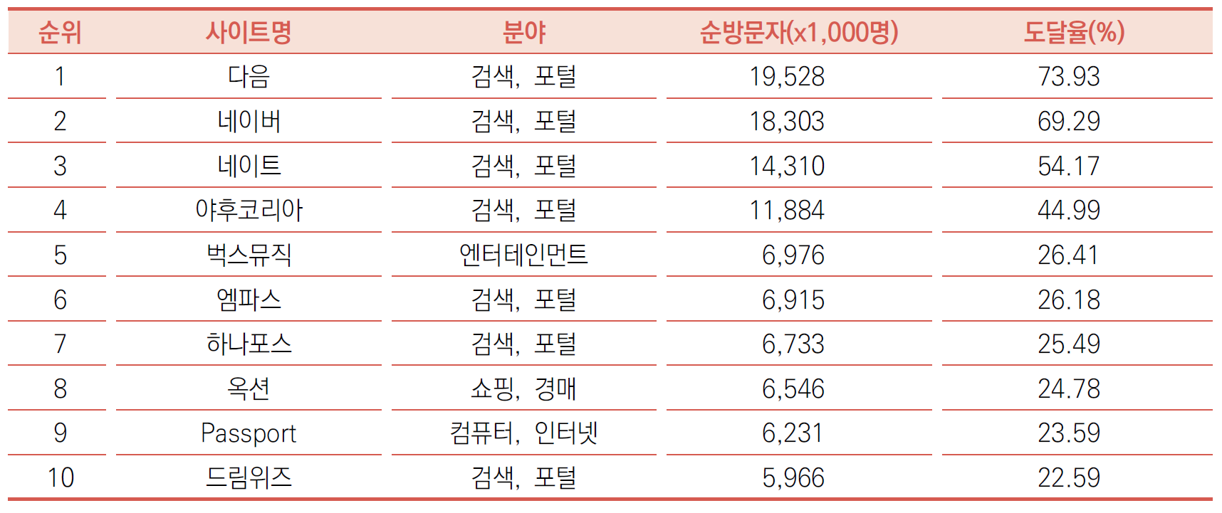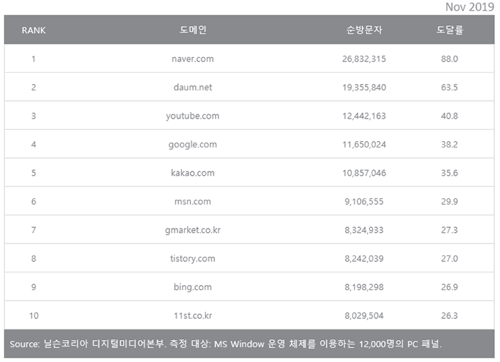 이 자료에 의하면 2019년 11월 현재 국내 최고 방문자를 기록한 PC 웹사이트는 네이버(naver.com)였다. 월간 순방문자 26,832,315명으로 88%의 도달률을 보였다. 2위는 다음(daum.net)으로 19,355,840명(도달률 63.5%)이었다. 유투브와 구글은 각각 3위, 4위였다.