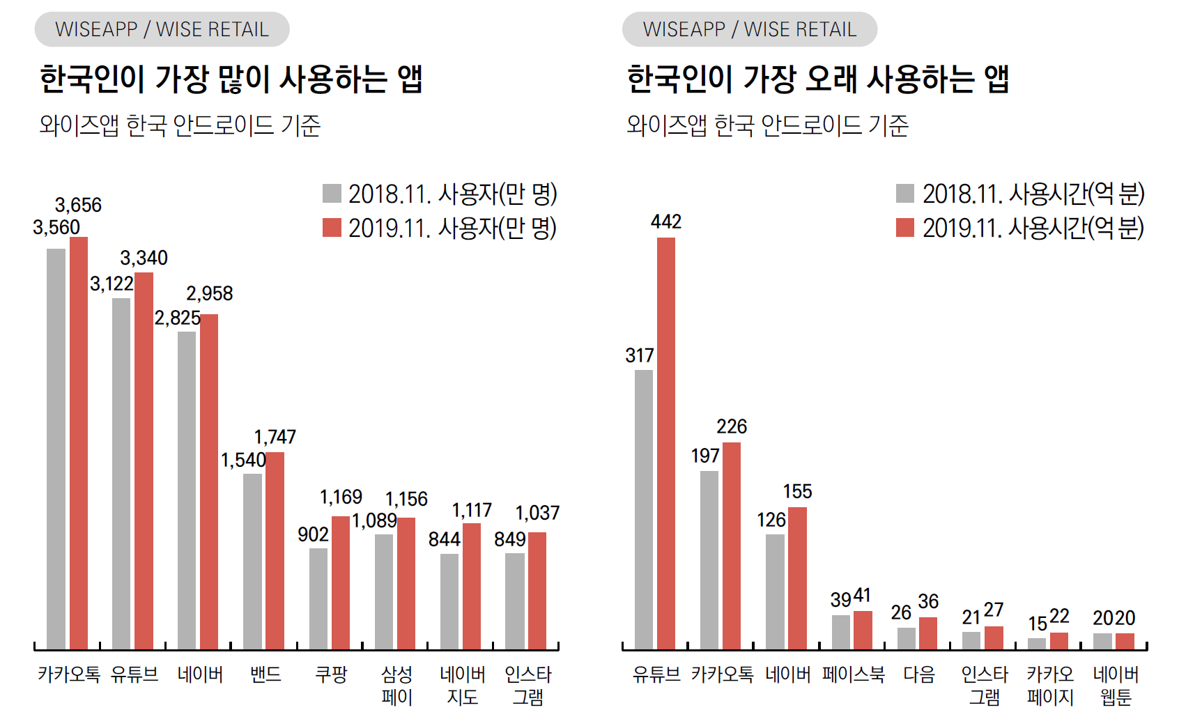 반면, 모바일 애플리케이션 분야에서는 카카오톡이 월간 순이용자 39,165,091명(도달률 97.2%)로 1위를 차지했다. 유투브(34,498,420명)와 네이버(31,515,272명)가 각각 2, 3위였다. 모바일 애플리케이션 카테고리별 순위에서는 엔터테인먼트 분야에서 네이버웹툰(Naver Webtoon)이 월간 6,985,860명의 순이용자를 기록하며 5위, 카카오페이지가 5,932,035명의 순이용자로 8위를 기록했다.