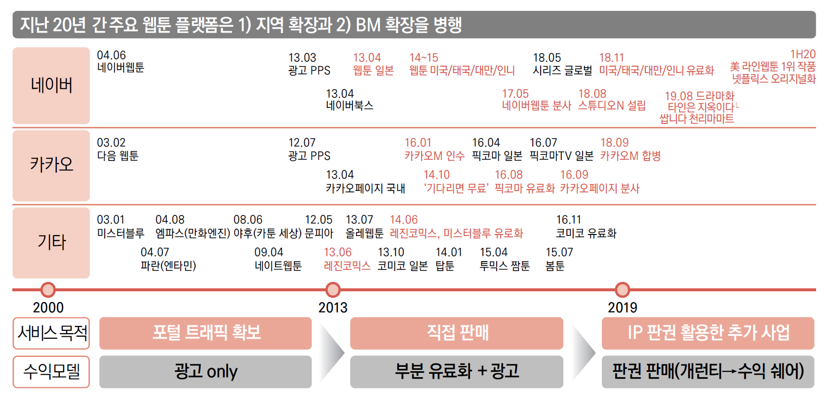 다음웹툰의 전략이 ‘웹툰의 창작과 소비문화를 창달’하는 쪽에 집중된 문화주의적인 접근 방식을 취하고 있다면 네이버웹툰의 전략은 ‘웹툰의 활용과 가치 확산에 주력’하는 상업주의적 접근 방식이라 할 수 있다. 선도기업으로서 다음웹툰의 역할이 ‘문화창달’에 있었다면 후발기업으로서 네이버웹툰의 역할은 ‘가치확산’에 있었다고 할 수 있다. 하지만 2013년 네이버와 다음으로 대표되는 포털웹툰 플랫폼은 거대한 변화에 직면하게 된다.