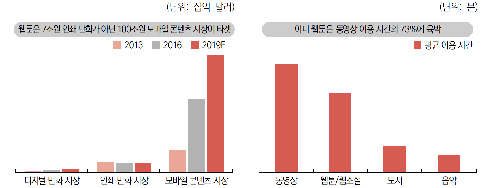 2019년 11월 미래에셋대우 리서치센터는 한국 웹툰의 경쟁 시장이 7조원 규모의 세계만화시장이 아니라 100조원 규모의 모바일 콘텐츠 시장이라고 주장했다. 국내시장에서 웹툰과 웹툰소설의 평균 이용시간이 동영상 이용 시간의 73%에 육박하고 있는 만큼 세계시장에서 웹툰에 대한 소비가 확산되고 이 같은 성과가 이어진다면 웹툰산업은 새로운 전기를 맞이할 것이란 전망이다.