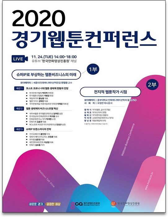경기도가 주최하고 한국만화영상진흥원과 경기콘텐츠진흥원이 공동으로 주관하는 2020 경기웹툰컨퍼런스는 50여명의 사전신청자가 오프라인으로 현장에 참여하고 전 과정은 유튜브를 통해 생중계 된다.