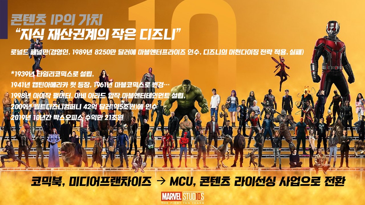 천문학적인 금액이고 디즈니의 욕심이라는 평가도 많았지만 디즈니가 마블을 인수하고 마블스튜디오를 설립한지 10년이 되던 해에 영화관객수익만 우리 돈으로 21조원을 벌었습니다.