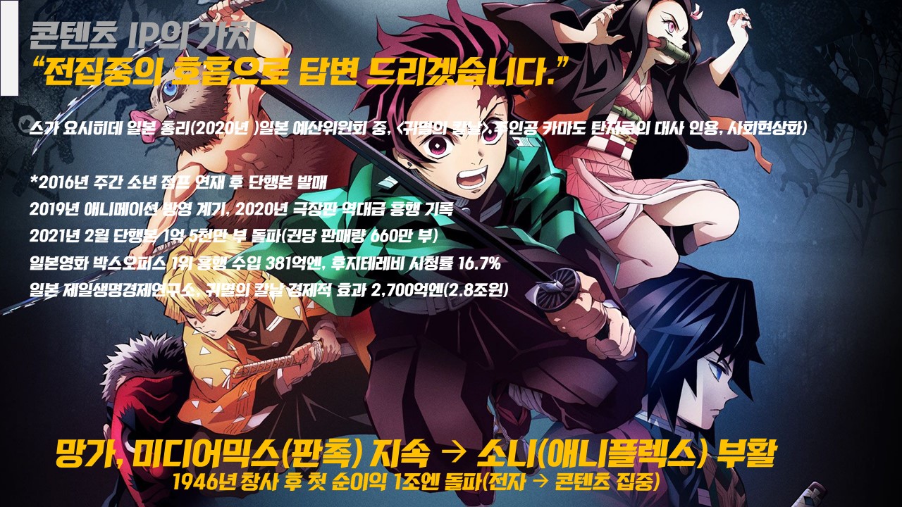 무엇보다 중요한 것은 전기제품 팔던 소니가 이 작품의 흥행으로 1946년 창사 이후 첫 순이익 1조엔을 돌파합니다. 이 작품이 소니엔터테인먼트의 자회사이자 애니메이션 배급사라 할 수 있는 애니플렉스에서 유통권을 지니고 있었기 때문입니다. 현재 소니의 매출구조는 전기제품 중심에서 콘텐츠 중심으로 전환되고 있는 상태입니다.