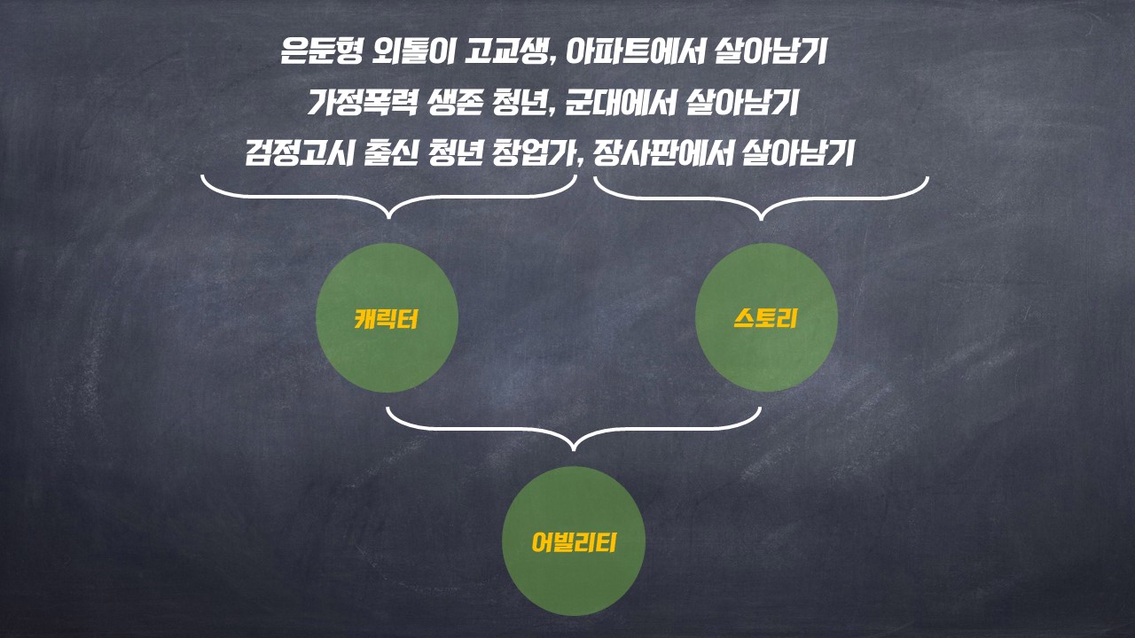 이 작품들에는 외톨이, 군인, 창업가라는 캐릭터가 있습니다. 캐릭터들은 살아남기라는 생존물 플롯의 스토리에 따라 움직이고 각각의 문제 상황에서 이를 해결하는 능력을 지니고 있습니다.