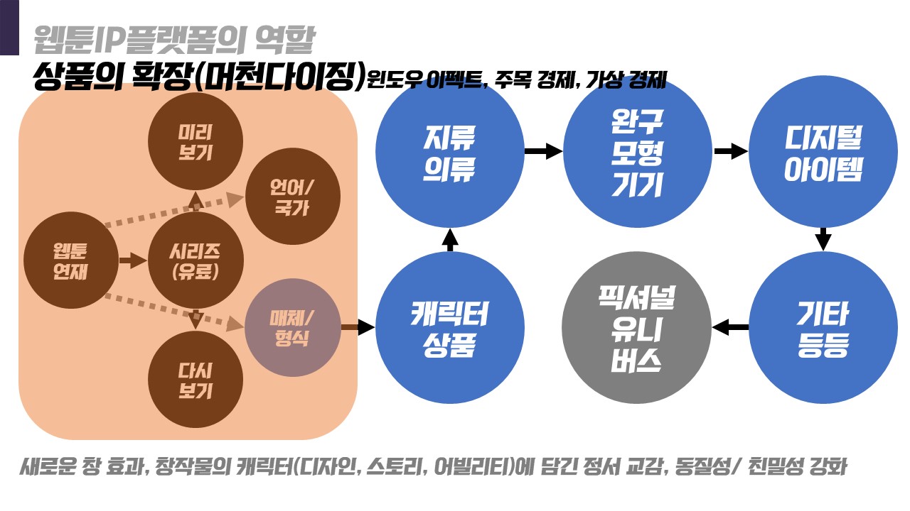 그 세계의 소비자는 단순한 웹툰 구독자에 머물지 않을 것이기 때문에 그 이상의 가치 포괄하는 지식재산권, IP가 등장한 것이겠죠.