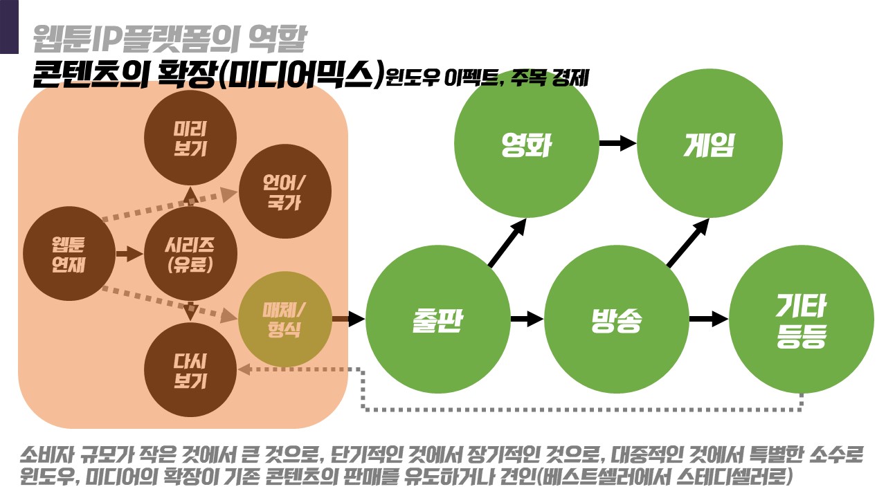 웹툰이 인기를 얻고 드라마가 되면 드라마를 통해 웹툰을 인지한 소비자가 확대되는 방식입니다.