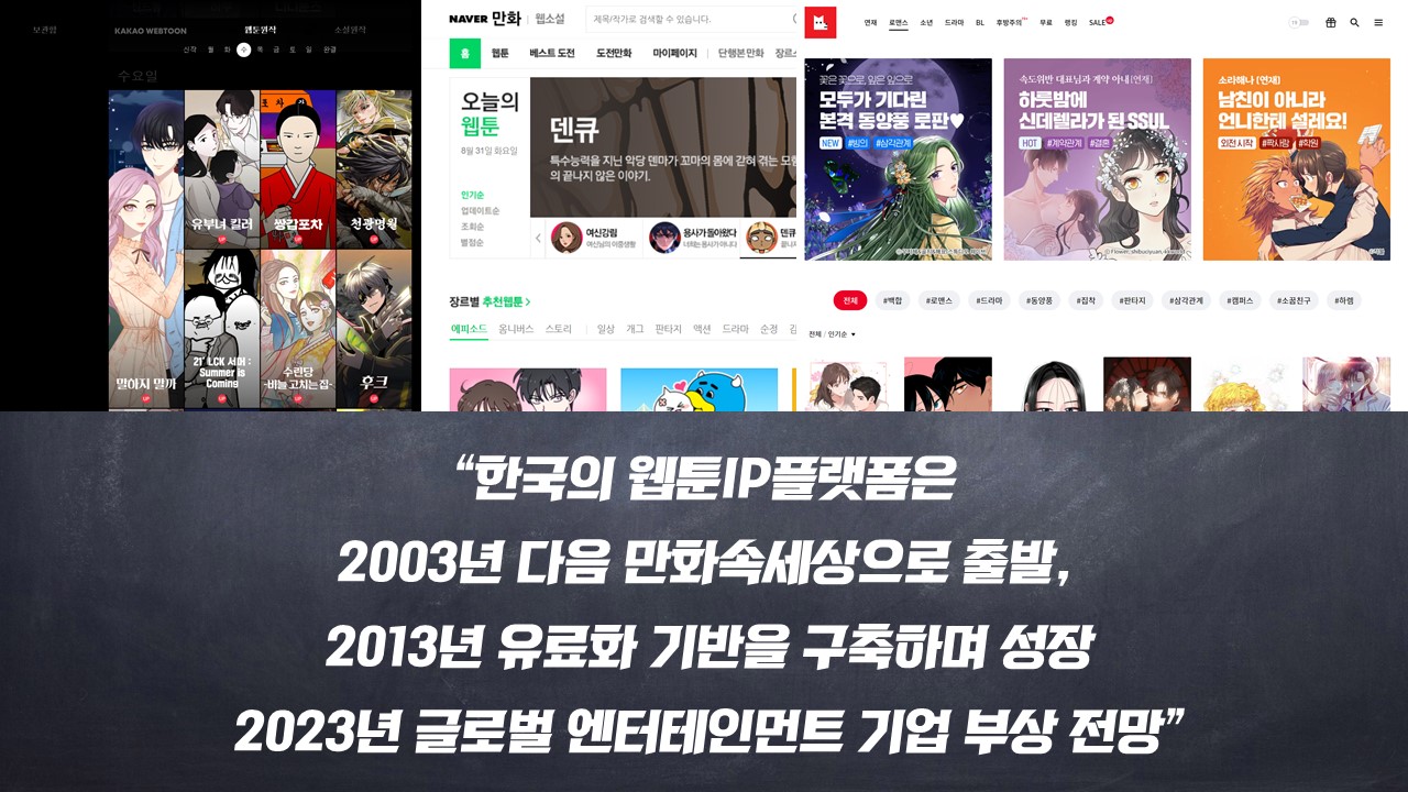 미국의 엔터테인먼트 시장에서는 마블이, 일본에서는 귀멸의 칼날이 그 같은 역할을 했습니다. 대중소비를 이끌어 낸 것이죠. 한국에서는 초고도화 된 인터넷 환경과 스마트미디어 환경이 구축된 웹툰플랫폼 기업이 이 같은 역할을 하고 있습니다. 저는 2023년 쯤이면 웹툰분야에서 글로벌 엔터테인먼트 기업이 등장할 것이라 감히 전망합니다.
