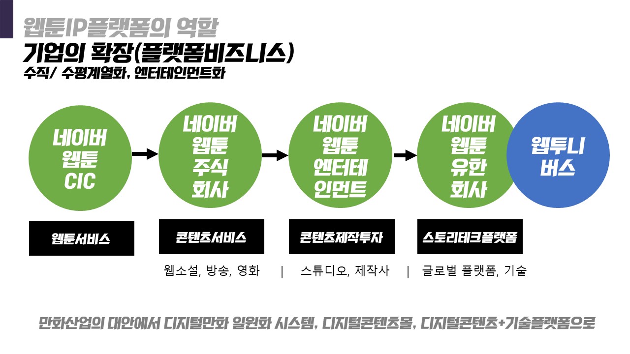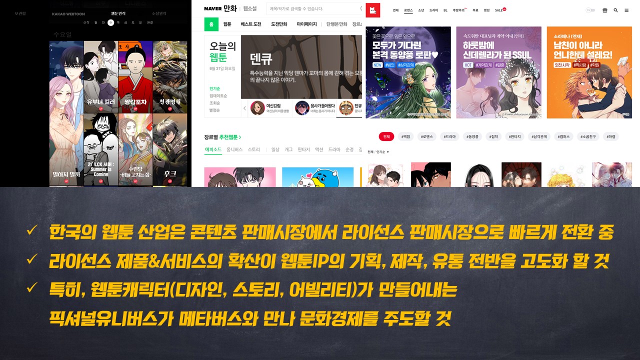 미국의 코믹북, 일본의 망가산업에 비춰볼 때 한국의 웹툰산업이 그렇게 발전해 갈 것이라 보는 것이고 그 기업들은 생존을 위해 그만한 웹툰아이피를 탄생시켜야 한다는 것입니다.