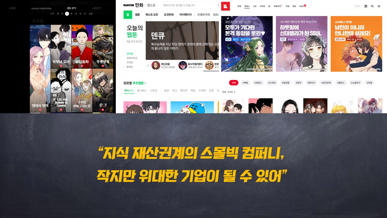 그 중심에, 아니 최전선에 웹툰아이피플랫폼 기업들이 뛰고 있습니다. 그러니 이 기업드를 지식재산권계의 스몰빅 컴퍼니, 작지만 위대한 기업이라 할 수 있을 것입니다.