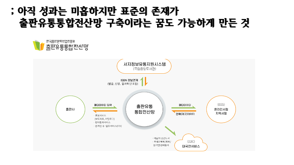 국립중앙도서관의 서지정보유통지원시스템(아이에스비엔)이 있으니 이를 기반으로 출판유통통합전산망이라는 장대한 비전도 수립할 수 있는 것.