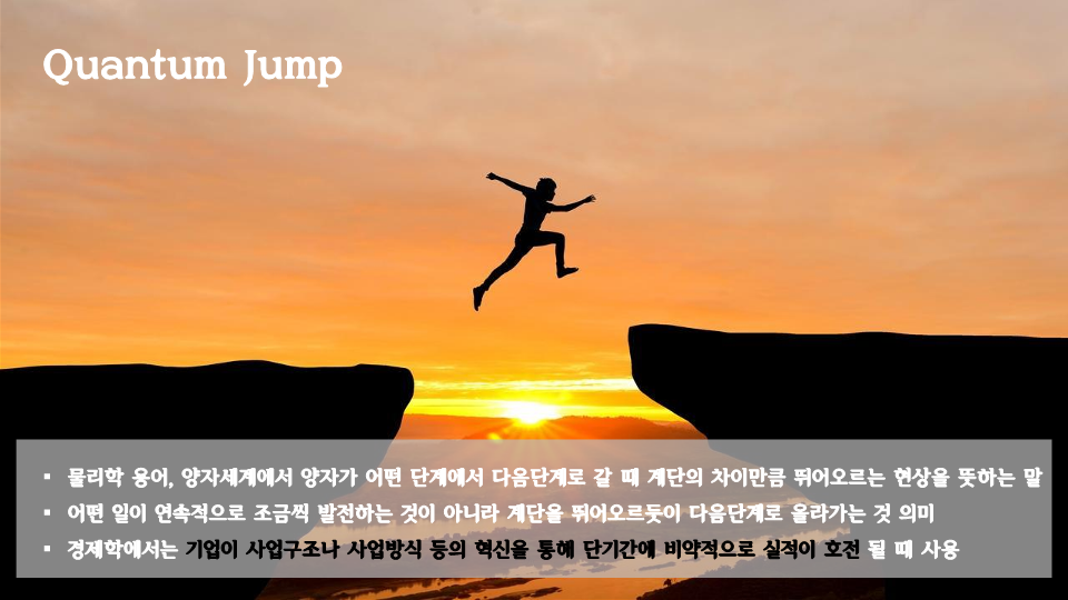 퀀텀점프는 양자가 어떤 단계에서 다음단계로 갈 때 계단의 차이만큼 뛰어오르는 현상을 의미 함.