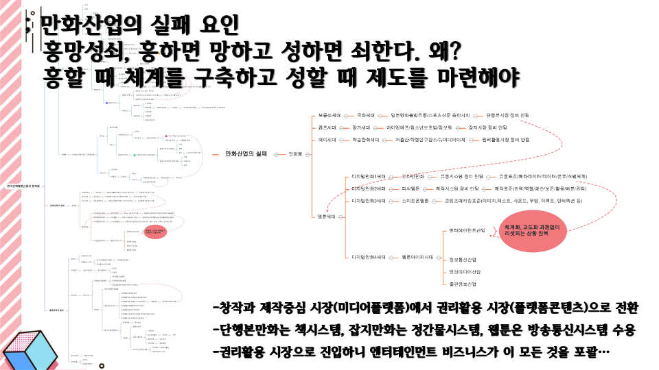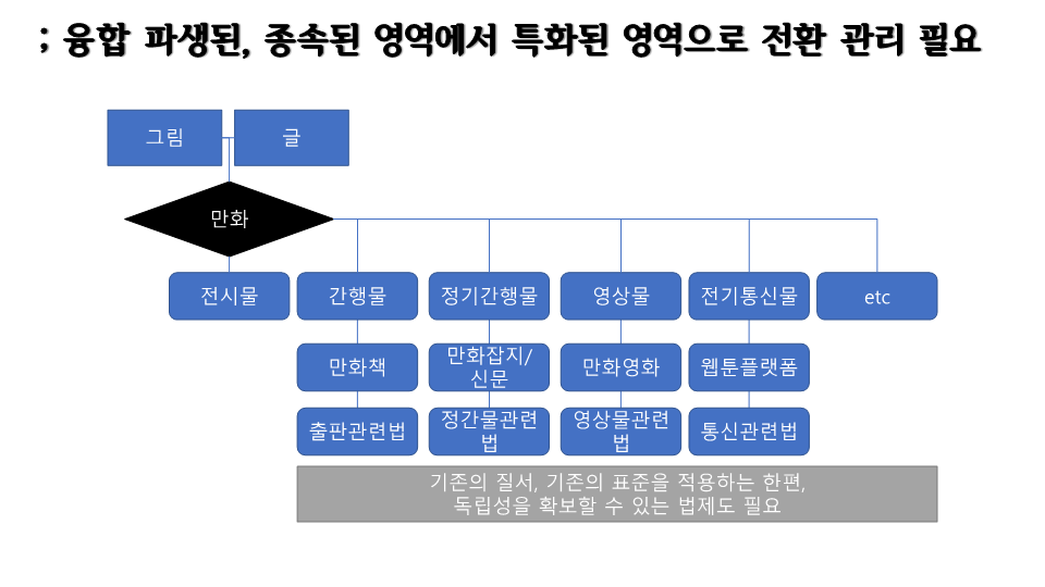 특히, 기존의 만화산업이 다른 매체나 산업군에 종속된 형태로 발전한 측면이 있어서 이를 포괄할 수 있는 개념 정립도 필요.