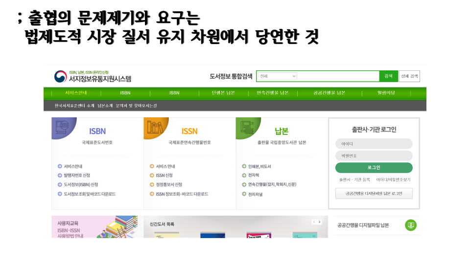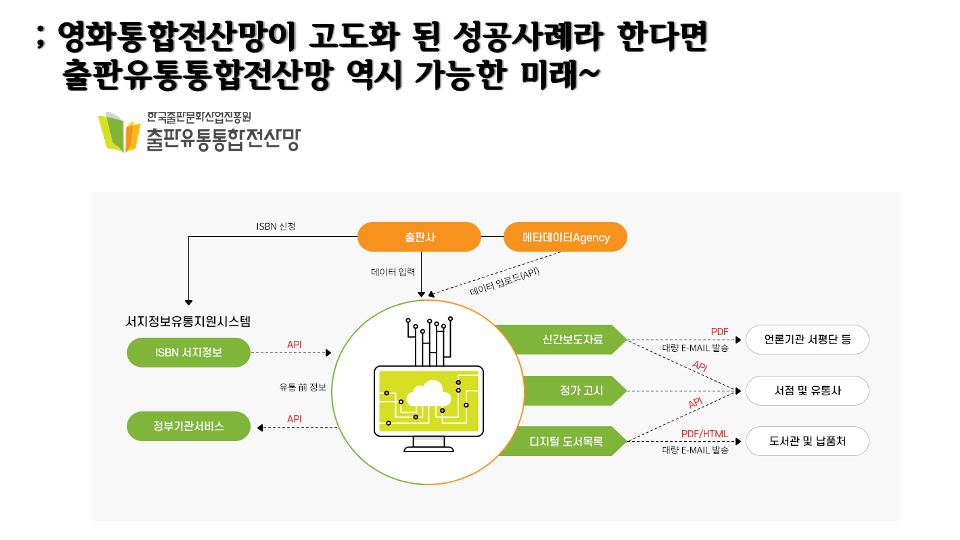 국립중앙도서관의 서지정보유통지원시스템(아이에스비엔)이 있으니 이를 기반으로 출판유통통합전산망이라는 장대한 비전도 수립할 수 있는 것.