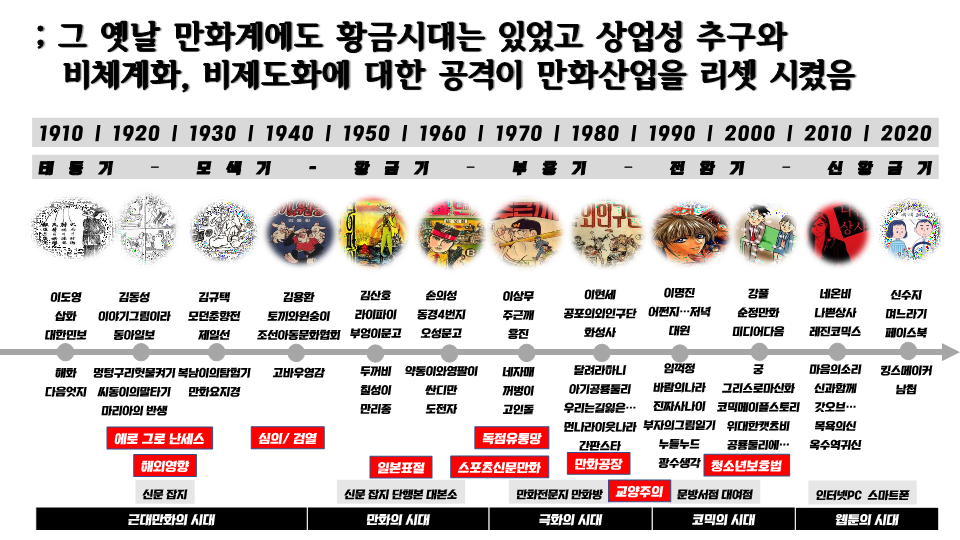 내부적으로 체계화 되지 못한 시장은 시민사회와 정부의 관여 앞에 놓였고 관 주도의 제도화는 성장 일로에 있던 만화산업을 반토막 내거나 리셋 시켜버렸음.