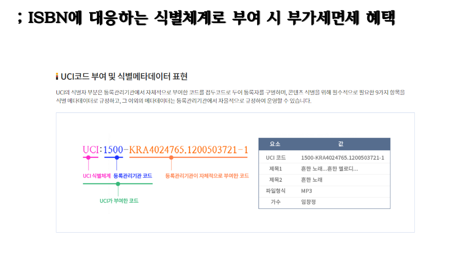대상 기준 고시에서 자료번호(아이에스비엔)를 받아야 한다고 했으나 콘텐츠산업진흥법 제23조 콘텐츠식별체계의 식별자(유씨아이)로 갈음할 수 있다고 규정.