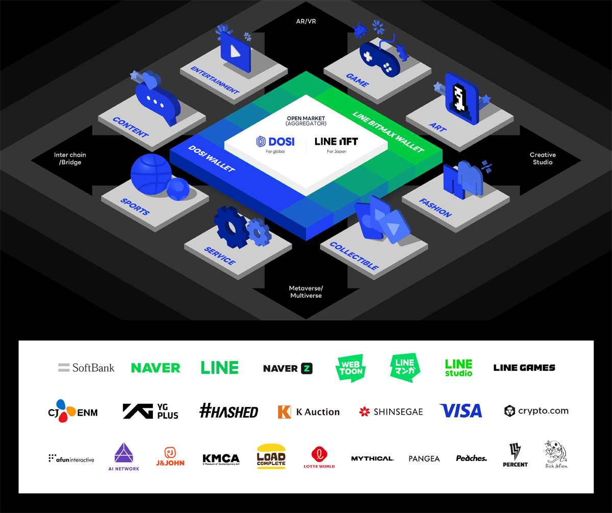 네이버 계열인 라인넥스트는 ‘글로벌 대체불가토큰(NFT) 생태계 구축’을 위해 총 10개사와 1천만 달러(약 130억원) 규모의 전략적 투자 계약을 체결했다(ZDNET KOREA, 2022.07.13.). 야후 재팬의 소프트뱅크, 네이버, 네이버웹툰, 네이버제트, 라인게임즈, CJENM, 와이지플러스, 신세계, 해시드, 케이옥션 등이 참여해 글로벌 NFT 플랫폼 ‘도시(DOSI)’를 출시하고 IP콘텐츠 기반 NFT 사업 등을 추진한다. 라인넥스트는 다양한 IP를 보유한 콘텐츠, 유통, 게임, 엔터테인먼트 기업과 대중에게 친근한 NFT를 선보여 플랫폼을 활성화하고 소비자층을 넓힐 계획이다.