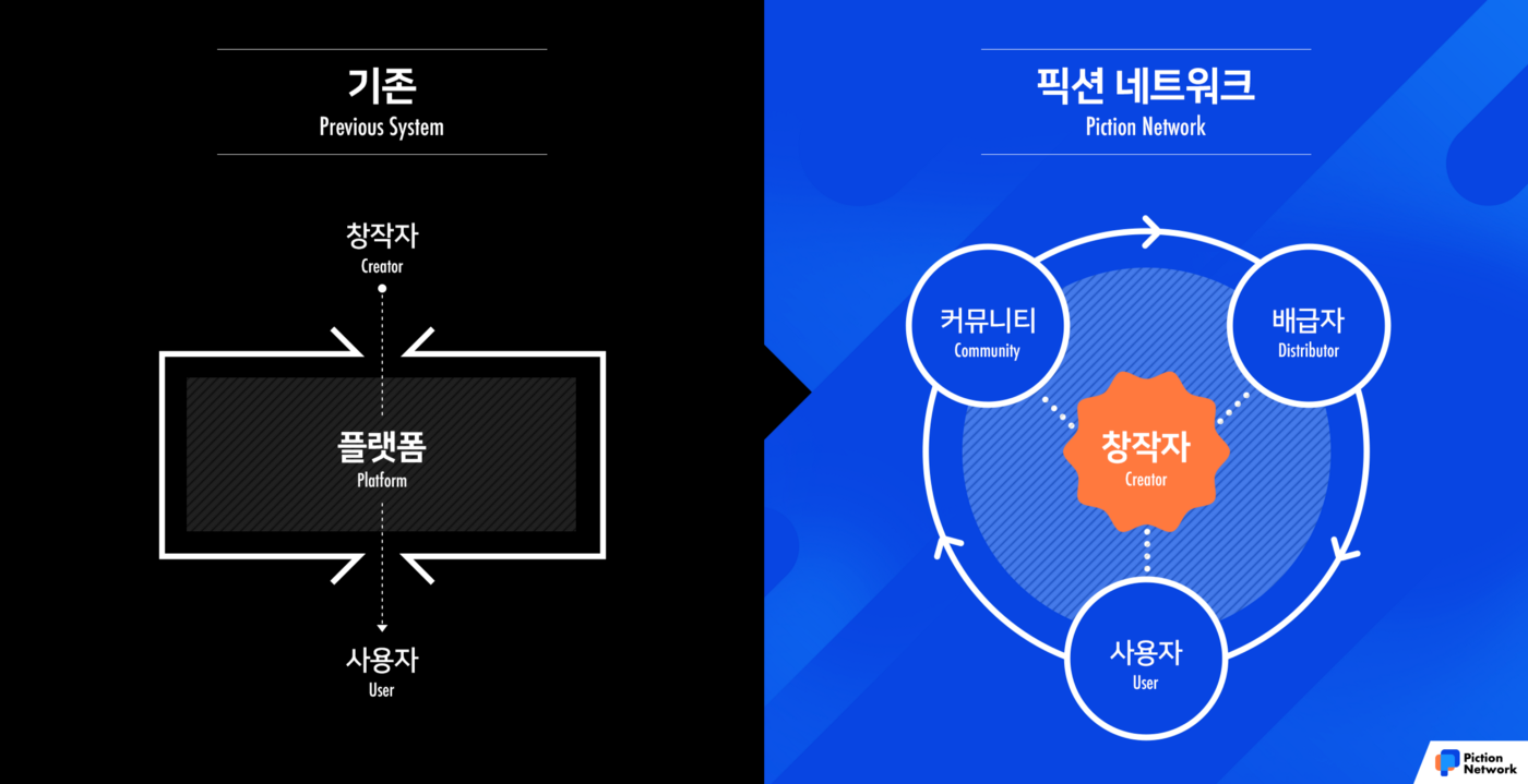 국내 웹툰산업 내에서 블록체인 기술을 활용한 최초의 의미 있는 사례는 2018년 서비스를 오픈한 픽션네트워크에서 찾을 수 있다. 픽션네트워크는 1인 창작자들이 플랫폼에 의존하지 않고 직접 유무형의 펀딩을 받아 작품을 연재할 수 있는 창작 생태계를 지향했다. 게임 소재 웹툰 연재 커뮤니티 플랫폼이라 할 수 있는 배틀코믹스의 배승익 대표가 주도한 프로젝트이다. 픽션은 카카오 계열인 클레이튼의 디앱(DApp)으로 화폐단위는 픽셀이다. 개념상으로는 1)콘텐츠 창작자가 커뮤니티를 중심으로 제작 자금을 직접 모집하고 2)투자자와 참여자 간 스마트 계약을 기반으로 3)콘텐츠 유통에 따른 혜택과 수익을 분배하는 방식이다. 2022년 7월 현재 일러스트, 웹툰, 텍스트, 영상, 사진 등의 카테고리를 중심으로 700여 개의 프로젝트(작품)이 오픈마켓 형식으로 등록되어 있다. NFT 옥션 메뉴도 있으나 전반적으로 운영 중단된 상태이다. 탈중앙화된 웹툰 생태계를 꿈꿨지만 표면상으로는 달성하지는 못한 것으로 보인다.