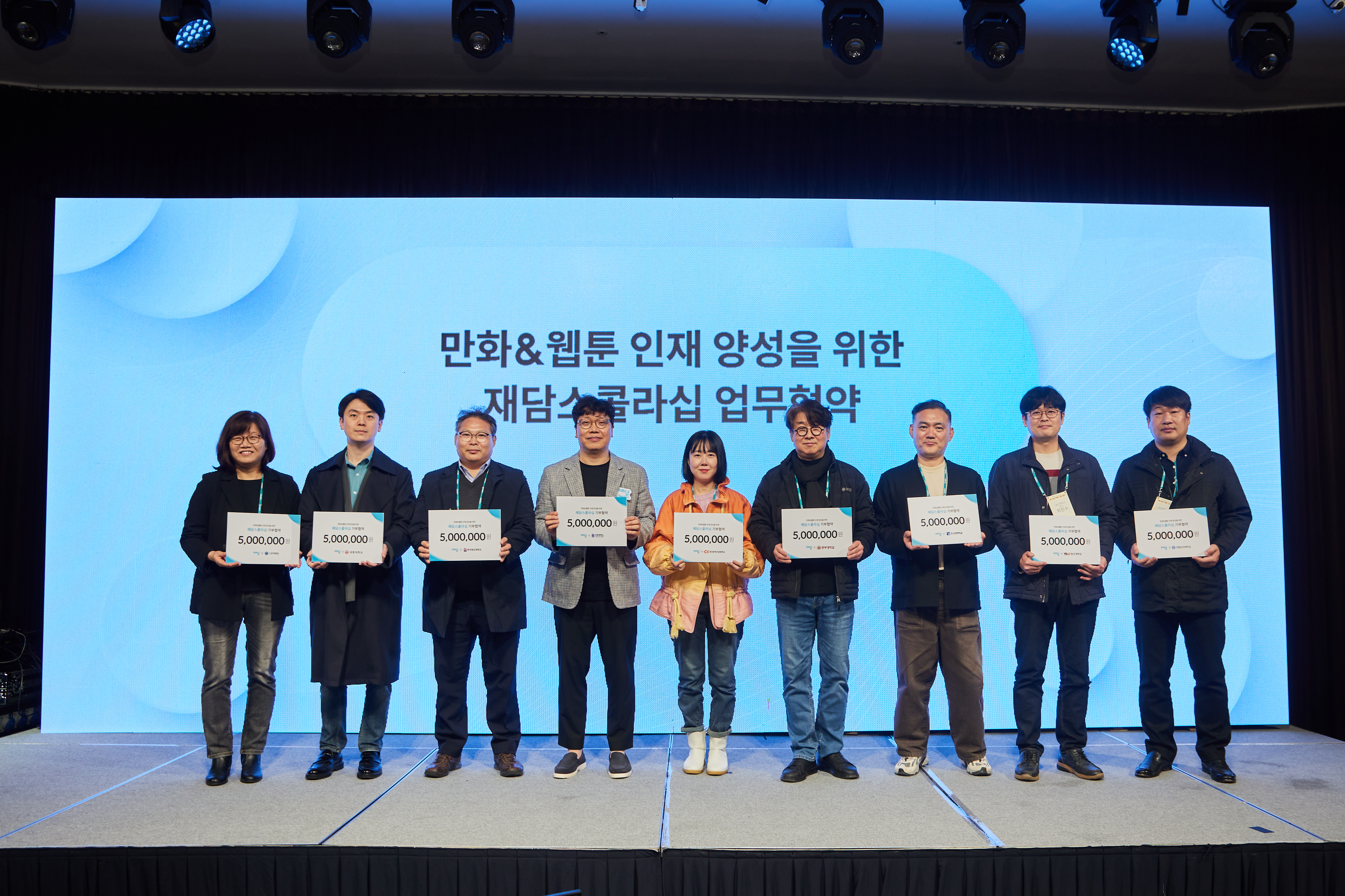 재담미디어가 만화와 웹툰 분야 인재 양성을 목적으로 전국 11개 대학과 장학금 기부 협약을 체결하고 ‘만화웹툰 교육과 산업의 발전’을 위해 상호 교류 및 협력을 강화하기로 했다.
