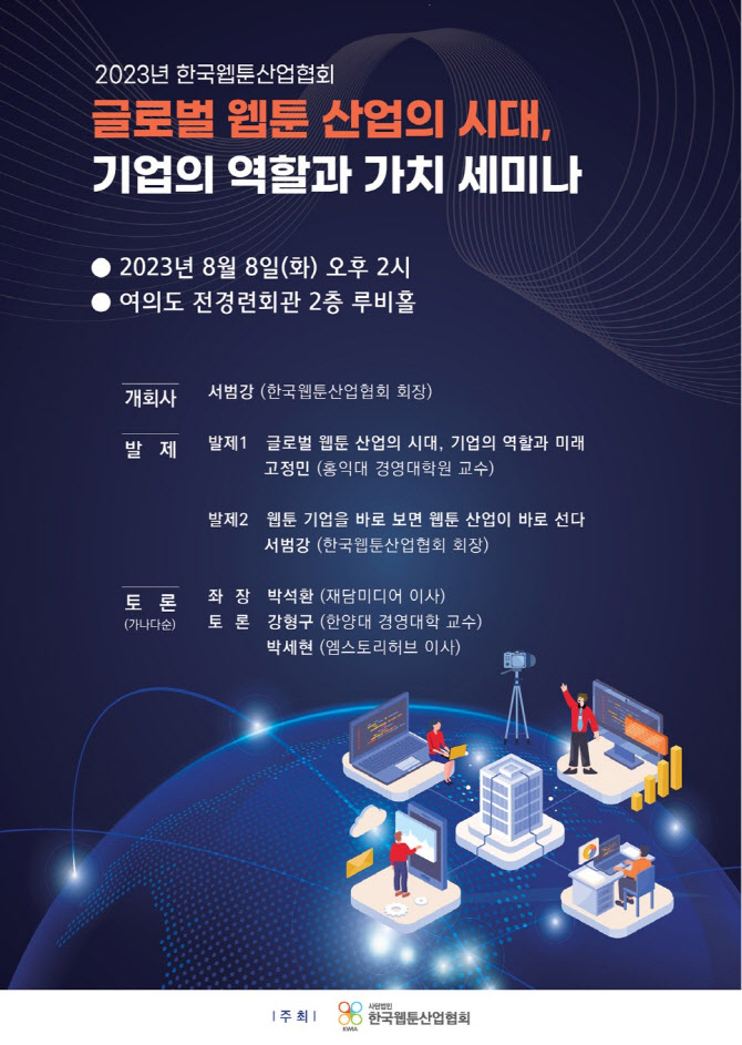 사단법인 한국웹툰산업협회(회장 서범강)가 지난 8일 여의도 전경련회관에서 ‘글로벌 웹툰 산업의 시대, 기업의 역할과 가치’를 주제로 세미나를 개최했다.