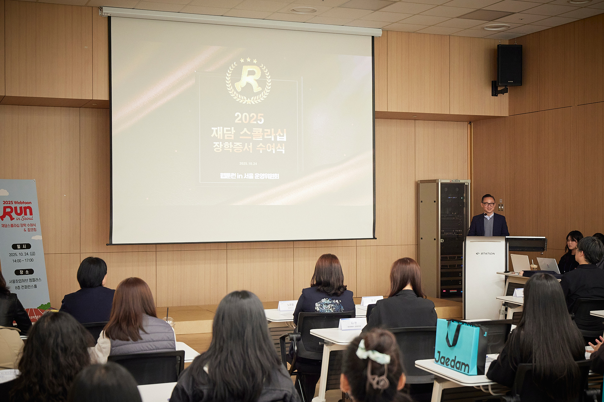2023년 재담미디어 창사 10주년을 계기로 시작된 이 프로그램은 '웹툰 창작 후속 세대의 성장'과 '조기 현장 진출 지원'을 목표로 진행되며 올해 3회째를 맞이했다. 그간 61명의 장학생에게 누적 1억 5,250만원의 장학금이 전달됐다. 2회째까지는 각 대학 지도교수들의 추천을 받아 장학생을 선발했으나, 올해부터는 공개 모집 방식으로 전환해 학생들이 자율적으로 참여할 수 있도록 개선했다. 신청자 300여 명 중 (사)한국만화웹툰학회, (사)한국웹툰산업협회, 와콤코리아 등이 참여한 운영위원회에서 장학생 20명을 최종 선발했다. 선발된 장학생들은 재담미디어와 서울경제진흥원이 공동 주최하는 웹툰런인서울 공모전에 초청 작가 형식으로 참가 중이다.