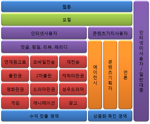반면, 웹툰의 가치사슬 구조는 출판과 동일하지만 참여하는 주체가 1단계 단축되어 만화가(창작자), 포털(제작/유통사), 유저(소비자)가 참여한다.