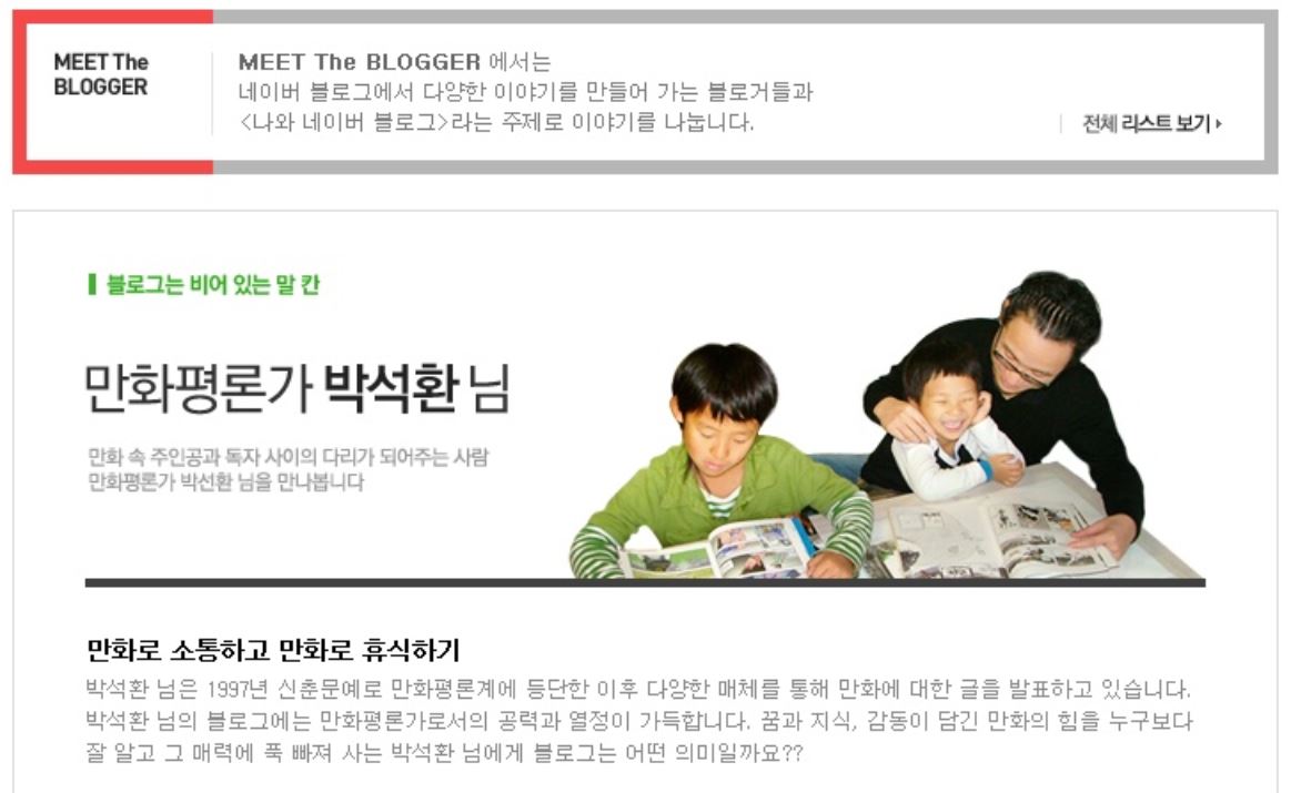 - 그리고 만화리뷰쓰기에 대한 책을 냈는데 이를 주제로 카페를 개설했습니다. 만화가 지금보다 더 풍요롭게 발전하기 위해서는 ‘만화리뷰’가 지금보다 더 많이 나와야 한다고 생각합니다. 그래서 ‘만화 리뷰 쓰는 블러거’들에게 작으나마 도움이 되는 강좌를 운영하고 있습니다.
