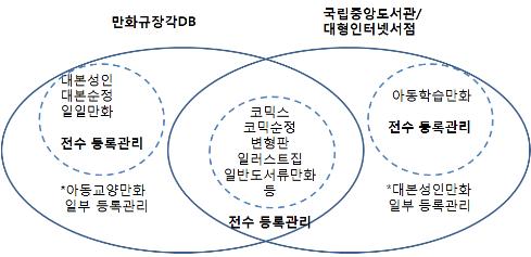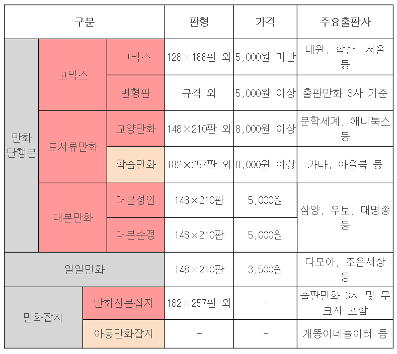 출판만화는 전통적으로 일반도서와 다른 생산과 유통 시스템을 구축해왔다. 만화전문출판사와 만화전문총판 그리고 대본소와 만화대여점 또는 만화전문매장(문방서점 등 포함)으로 이어지는 유통망은 독점성과 폐쇄성 등에 대한 비판을 받기도 했고, 일반도서 유통망을 중심으로 새로운 출판만화 시스템의 도전을 받기도 했다. 이 같은 흐름은 1960년대 대본소만화의 붐 이후로 지속되어 왔다. 수 십 년 간 만화전문출판사와 유통망이 존재했다. 또, 그 반대지점에서는 종합출판사 또는 대형 미디어사(신문, 잡지사)를 중심으로 한 출판만화 시장이 존재했다. 이처럼 이원화 되어 발전한 출판만화시장은 우리 만화의 내외적 형식을 구성하는 중요한 요인이 되기도 했고, 주 소비층과 소비형태 등에 따라 관련 시장을 대표하는 장르만화의 전통과 관습을 만들어내기도 했다. 그러나 디지털만화규장각과 인터넷서점의 만화 DB는 일반 소비자 대상의 정보 분류 기준을 취하고 있는 만큼 이를 기준으로 출판만화시장의 전통적 흐름과 새로운 도전을 계량화해서 분석하기는 어려운 측면이 있다. 이에 상기한 DB를 다음과 같은 기준으로 재분류 한다.